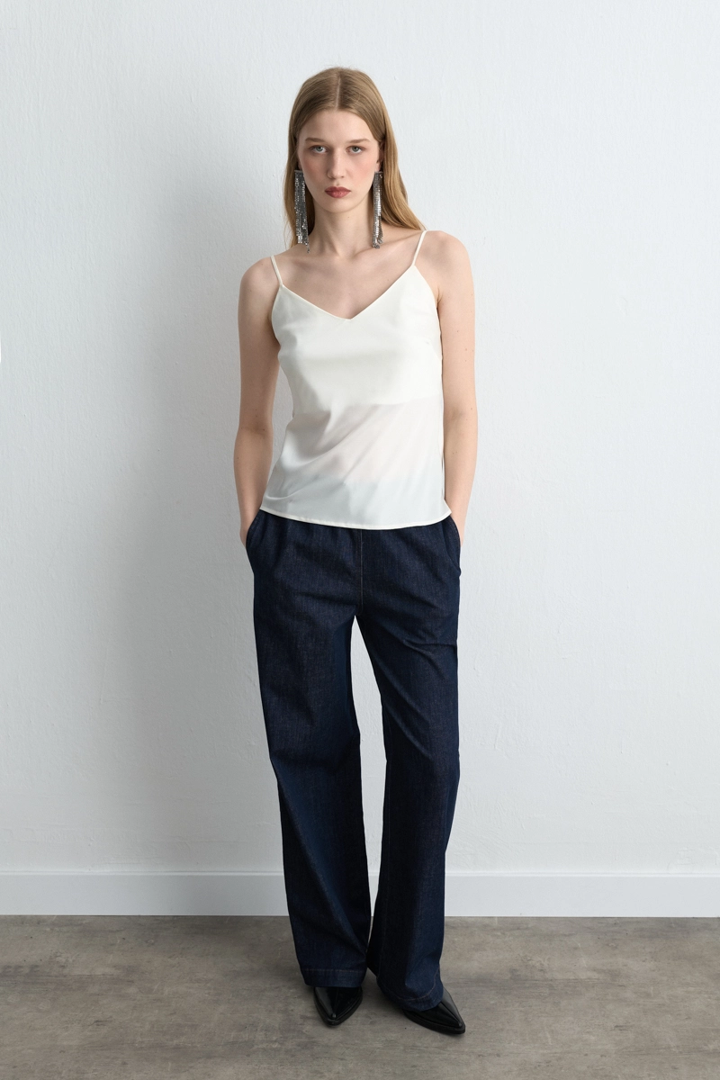 Ekru tonu doğal ve soft bir duruş kazandırır. Saten dokusu zarif bir parlaklık ve lüks bir his verir. İnce ip askılar modern ve feminen bir dokunuş ekler. Akıcı formu gün boyu rahatlık sağlar. Günlük kombinlerde veya şık davetlerde stilin öne çıkan tamamlayıcı parçalarından biridir.