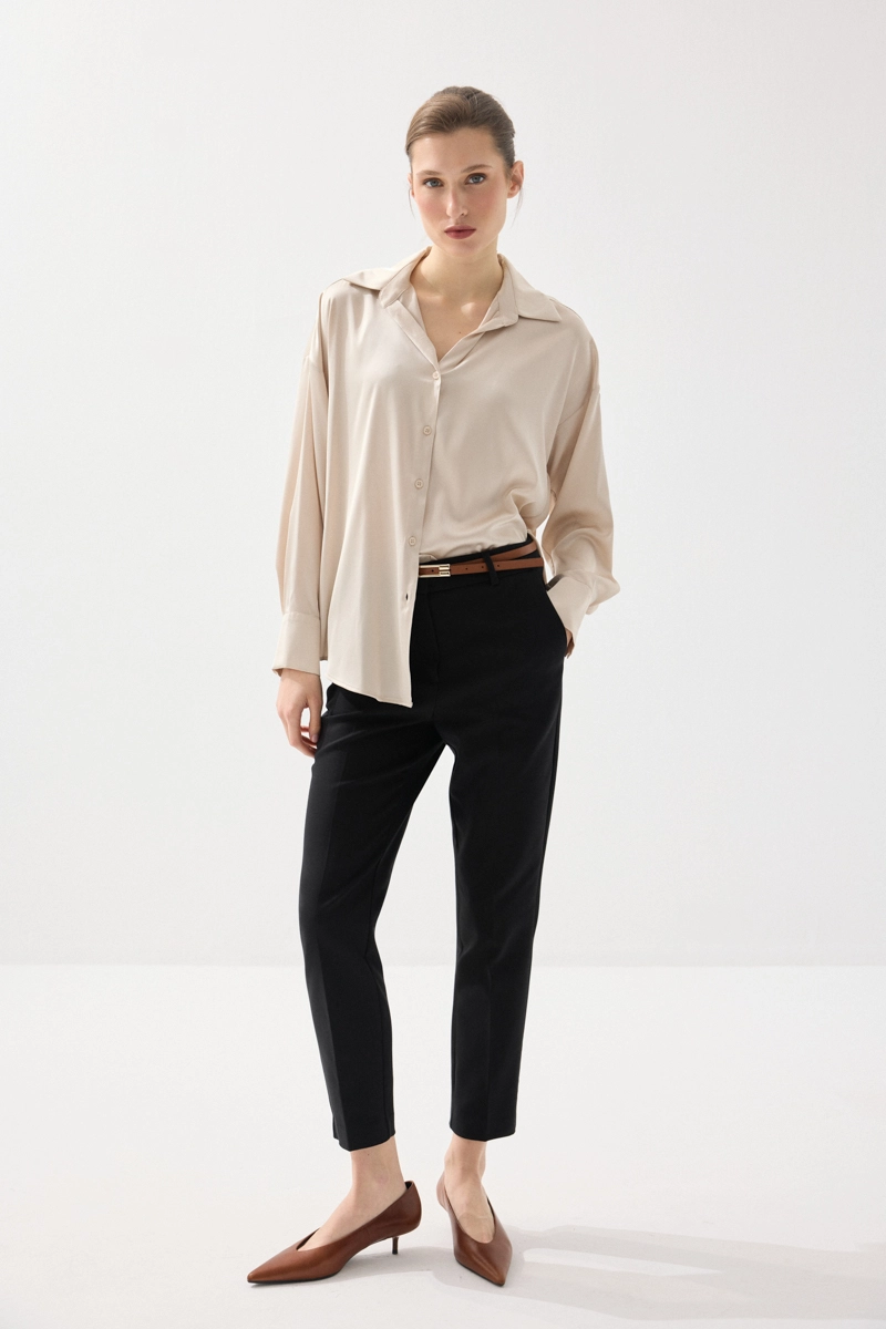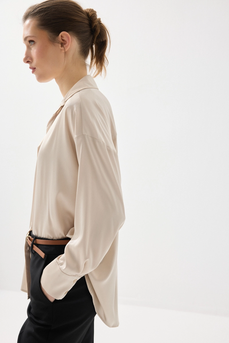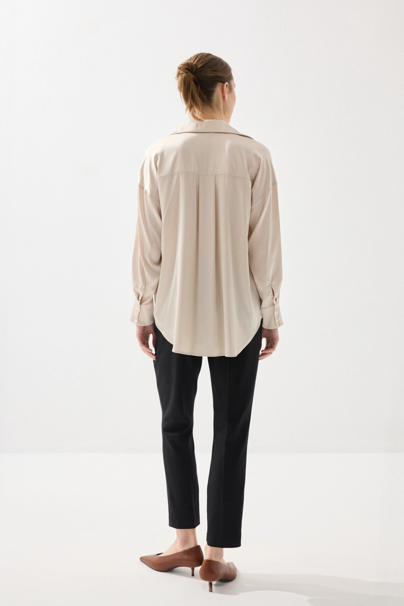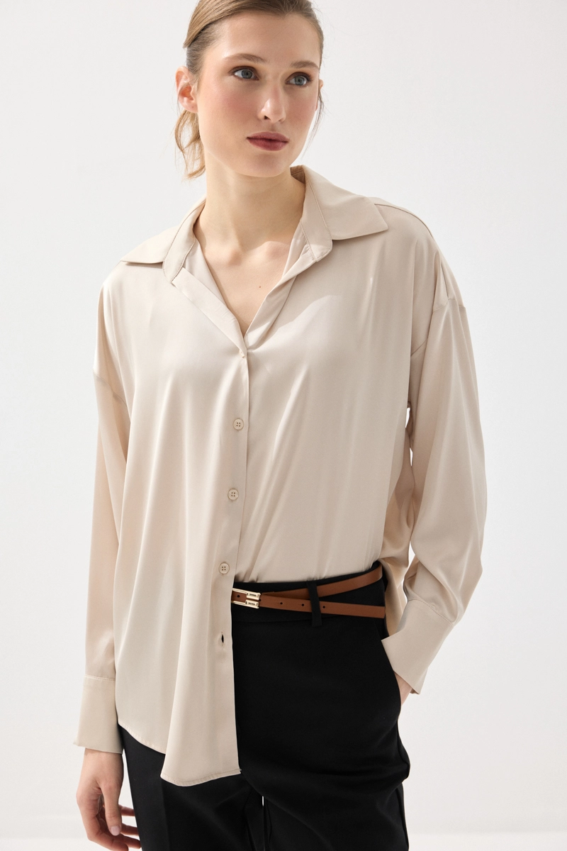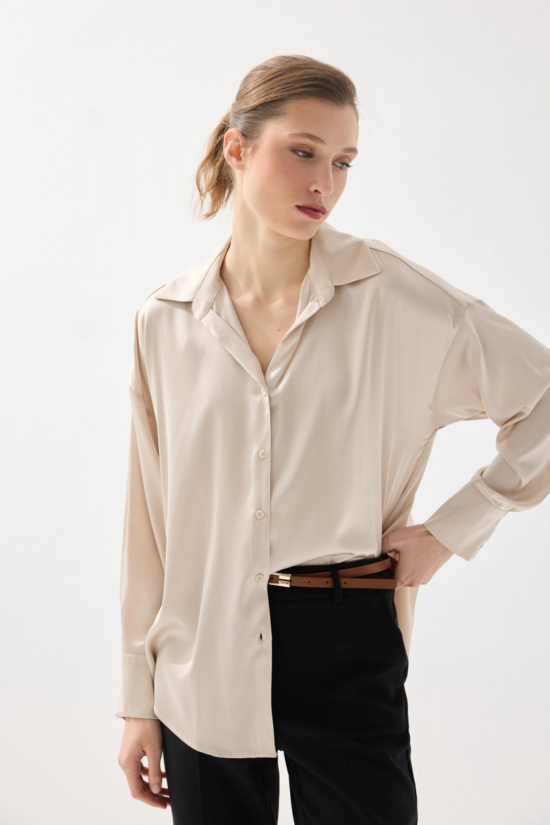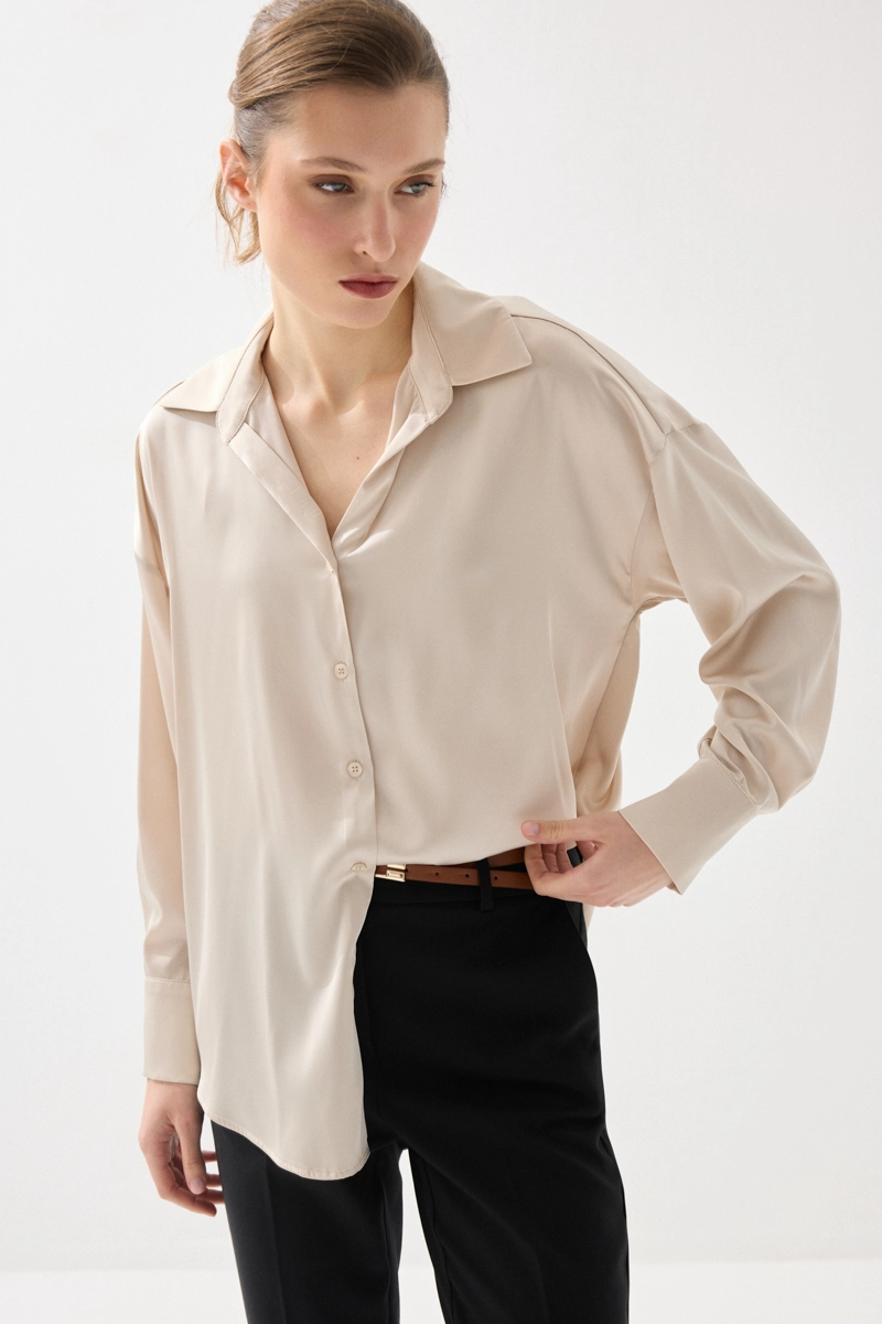 İpeksi saten dokusuyla pürüzsüz ve akıcı bir his sunan gömlek, rahat kesimiyle gün boyu konfor sağlar. Şık ve sade tasarımıyla farklı kombinlere kolayca uyum sağlar. Bej rengiyle zamansız ve zarif bir görünüm sunar. Günlük ve özel anlarda rahatlıkla tercih edilebilir. Stil sahibi kombinlerin tamamlayıcısıdır.