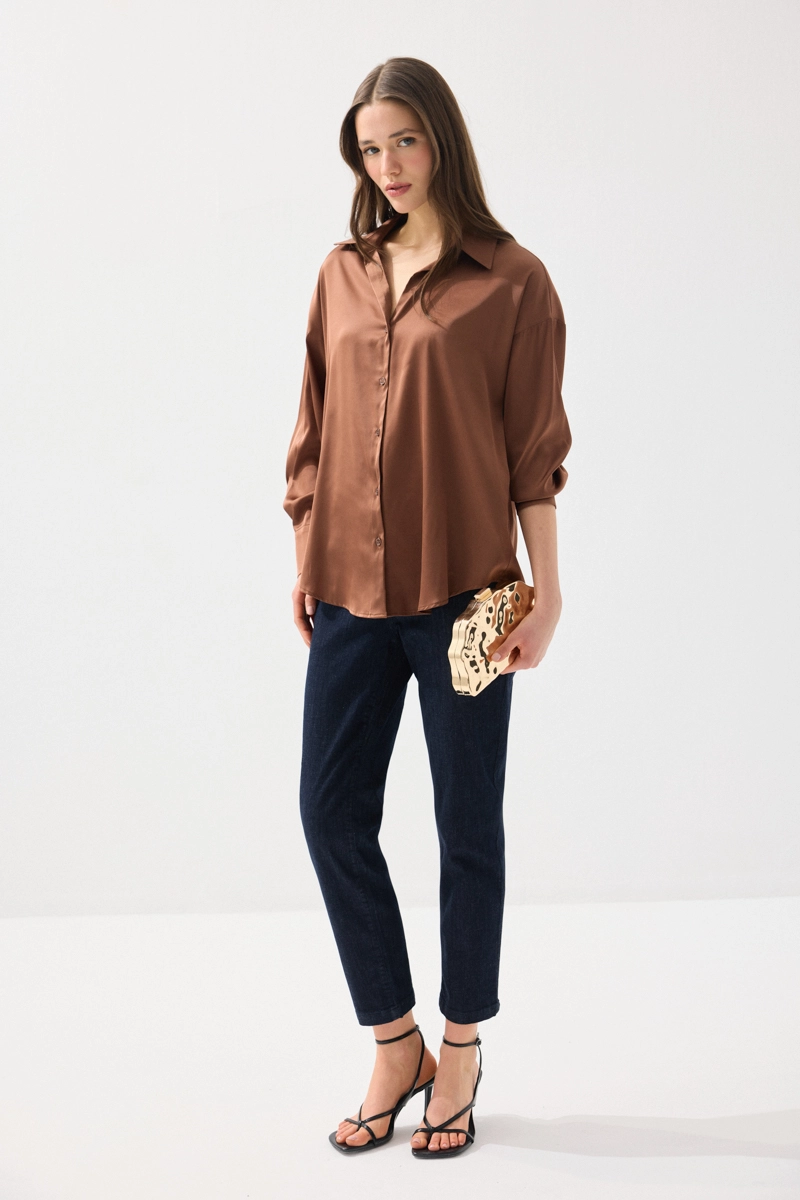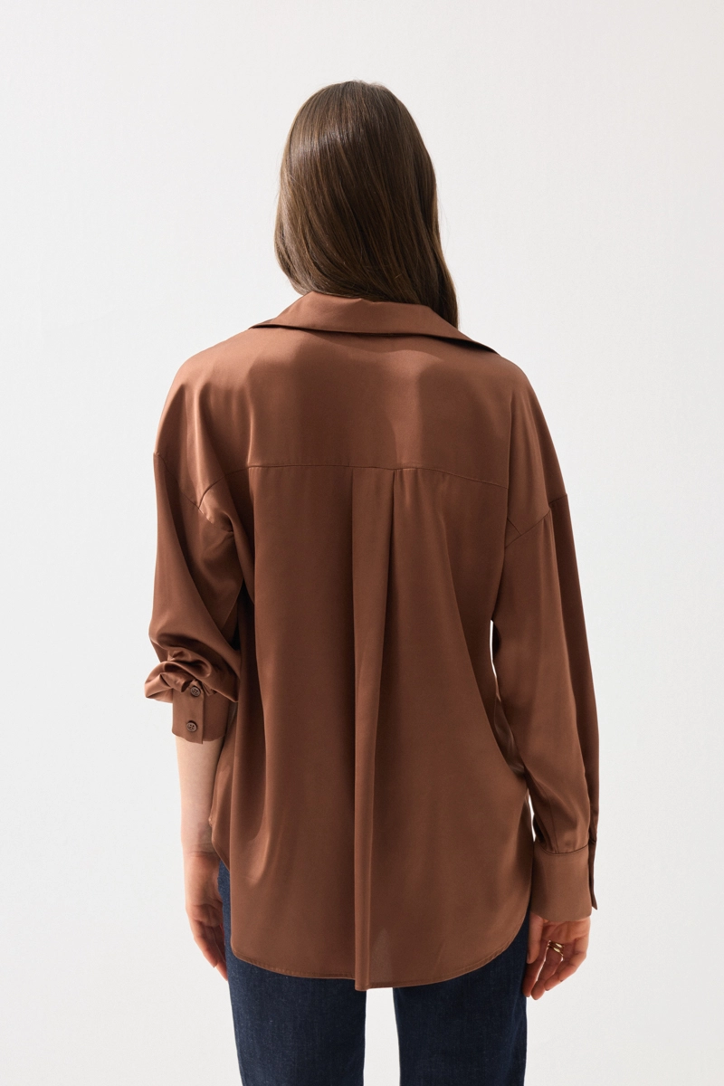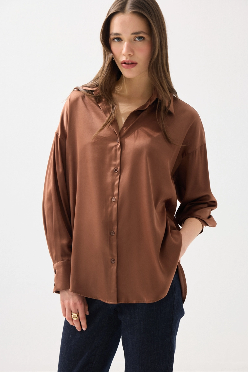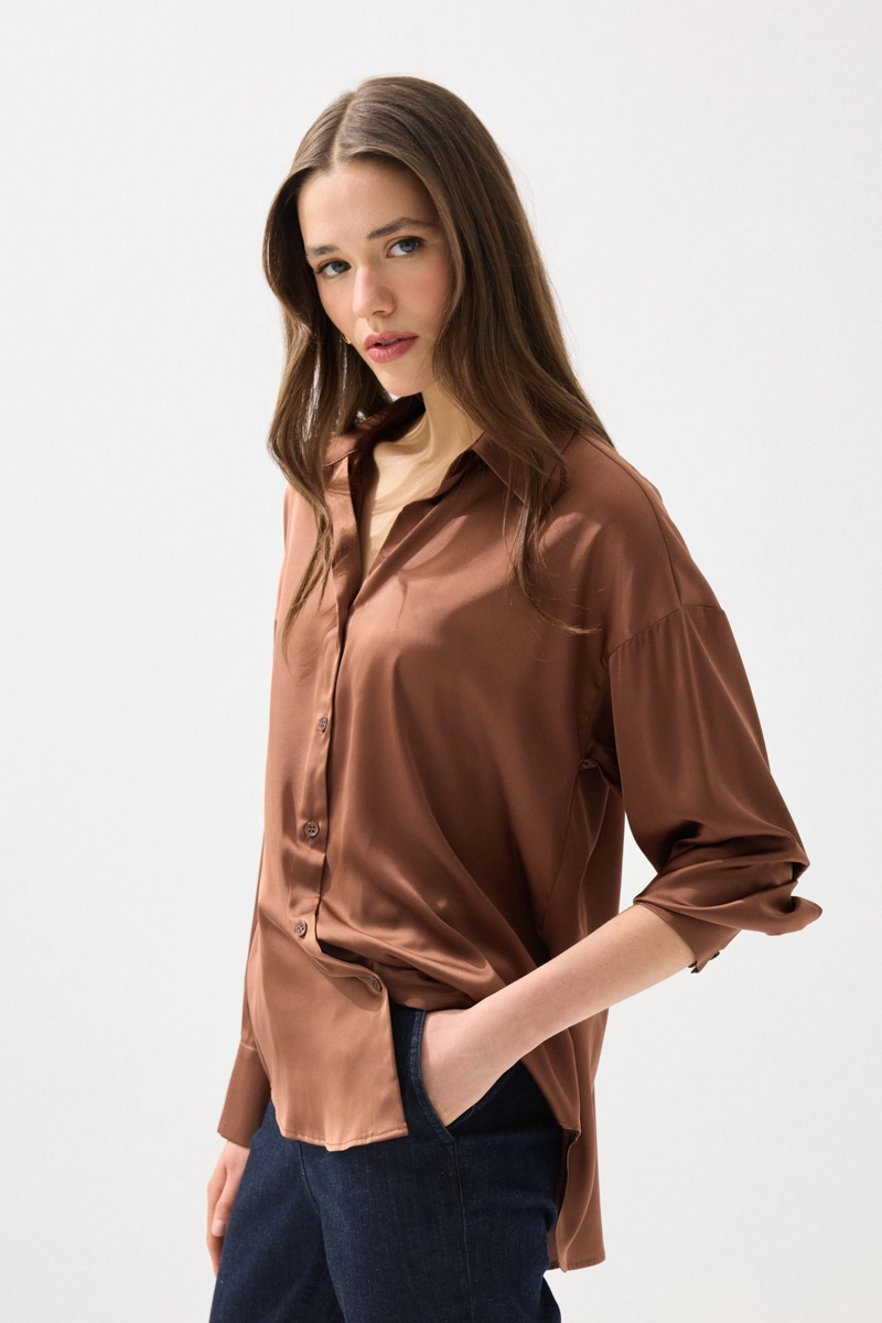 İpeksi saten dokusuyla pürüzsüz ve akıcı bir his sunan gömlek, rahat kesimiyle gün boyu konfor sağlar. Şık ve sade tasarımıyla farklı kombinlere kolayca uyum sağlar. Kahverengi tonu ile sıcak ve doğal bir görünüm sunar. Günlük ve özel anlarda rahatlıkla tercih edilebilir. Zamansız ve zarif bir parçadır.