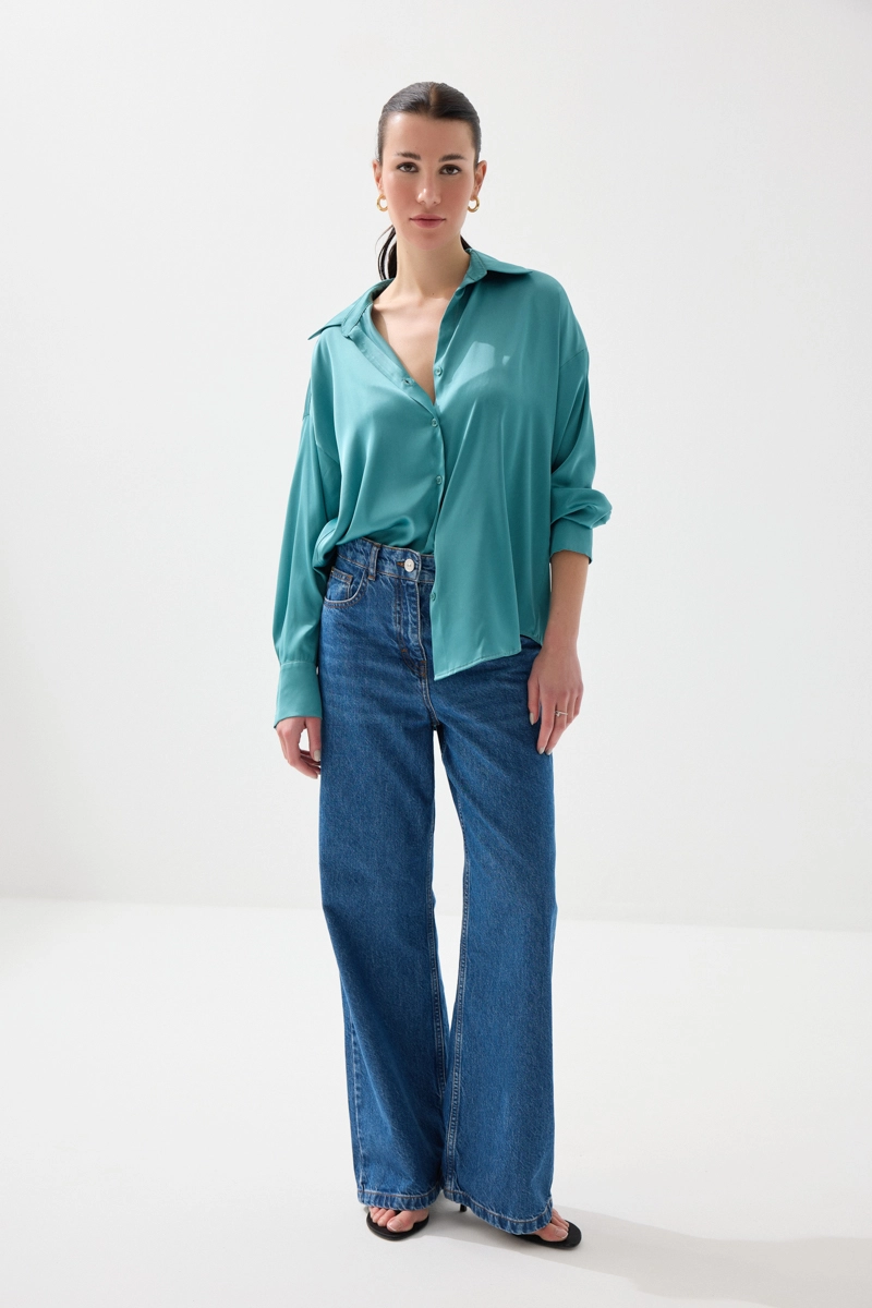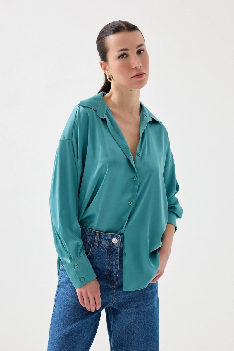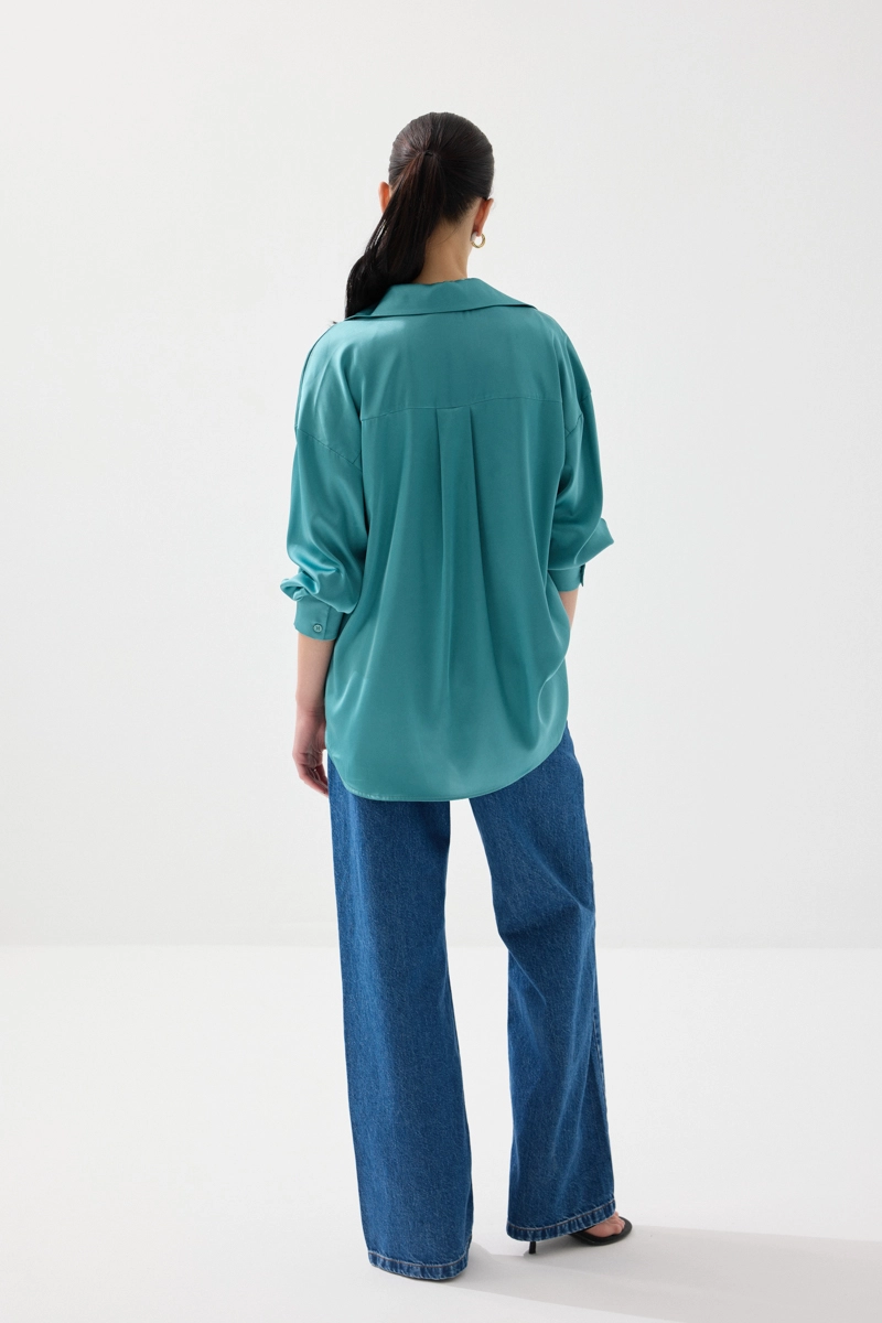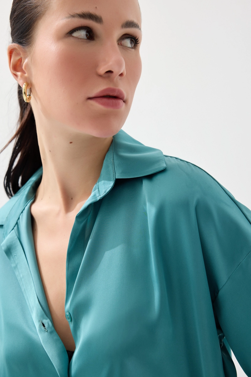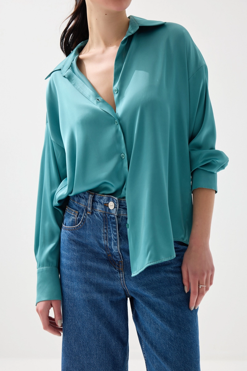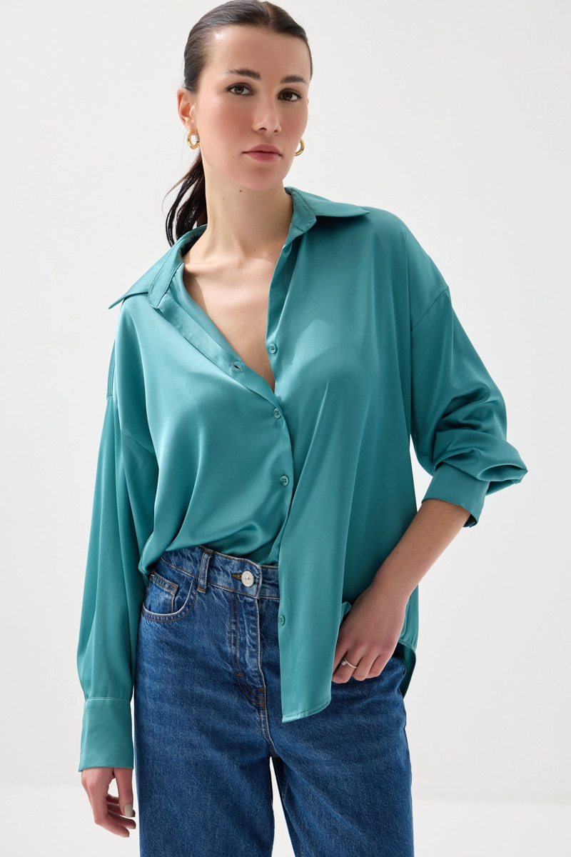 İpeksi saten dokusuyla pürüzsüz ve akıcı bir his sunan gömlek, rahat kesimiyle gün boyu konfor sağlar. Şık ve sade tasarımıyla farklı kombinlere kolayca uyum sağlar. Yeşil rengiyle stilinize enerjik ve sofistike bir dokunuş katar. Günlük ve özel anlarda rahatlıkla tercih edilebilir. Zamansız ve zarif bir parçadır.