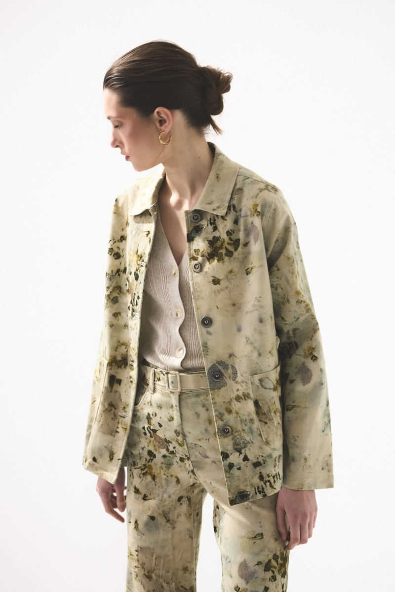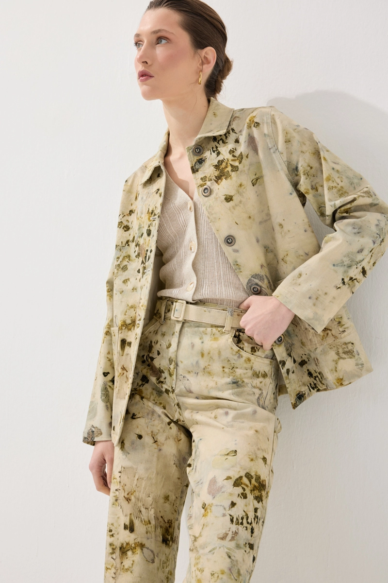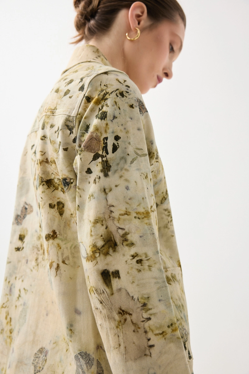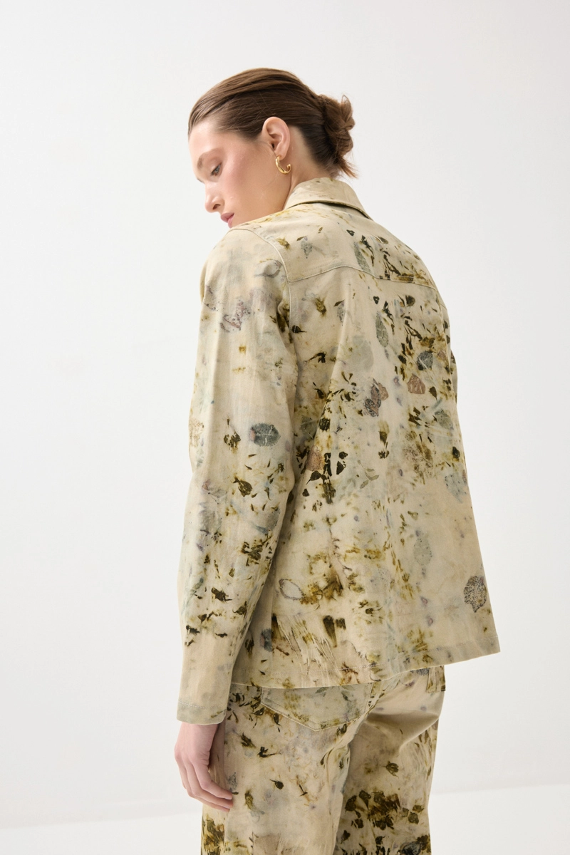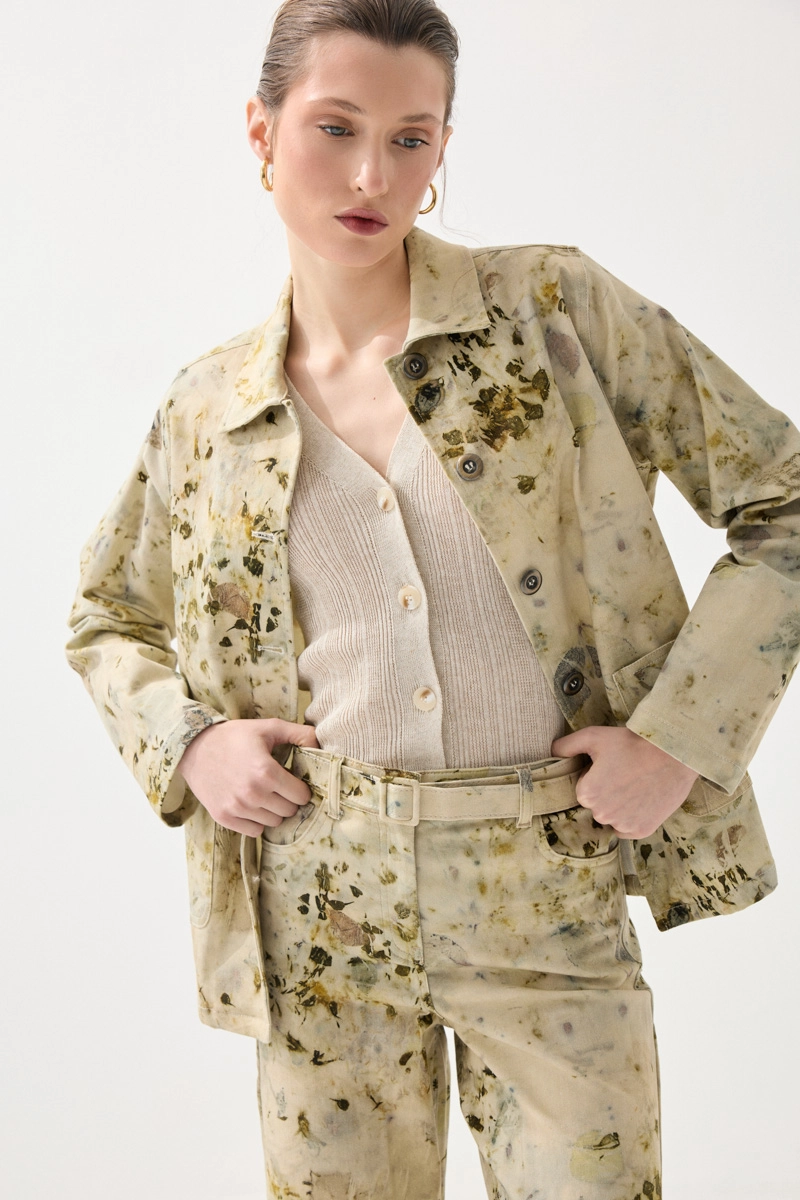 İz Koleksiyonu Eko Print Desenli Kanvas Ceket - Yeşil
