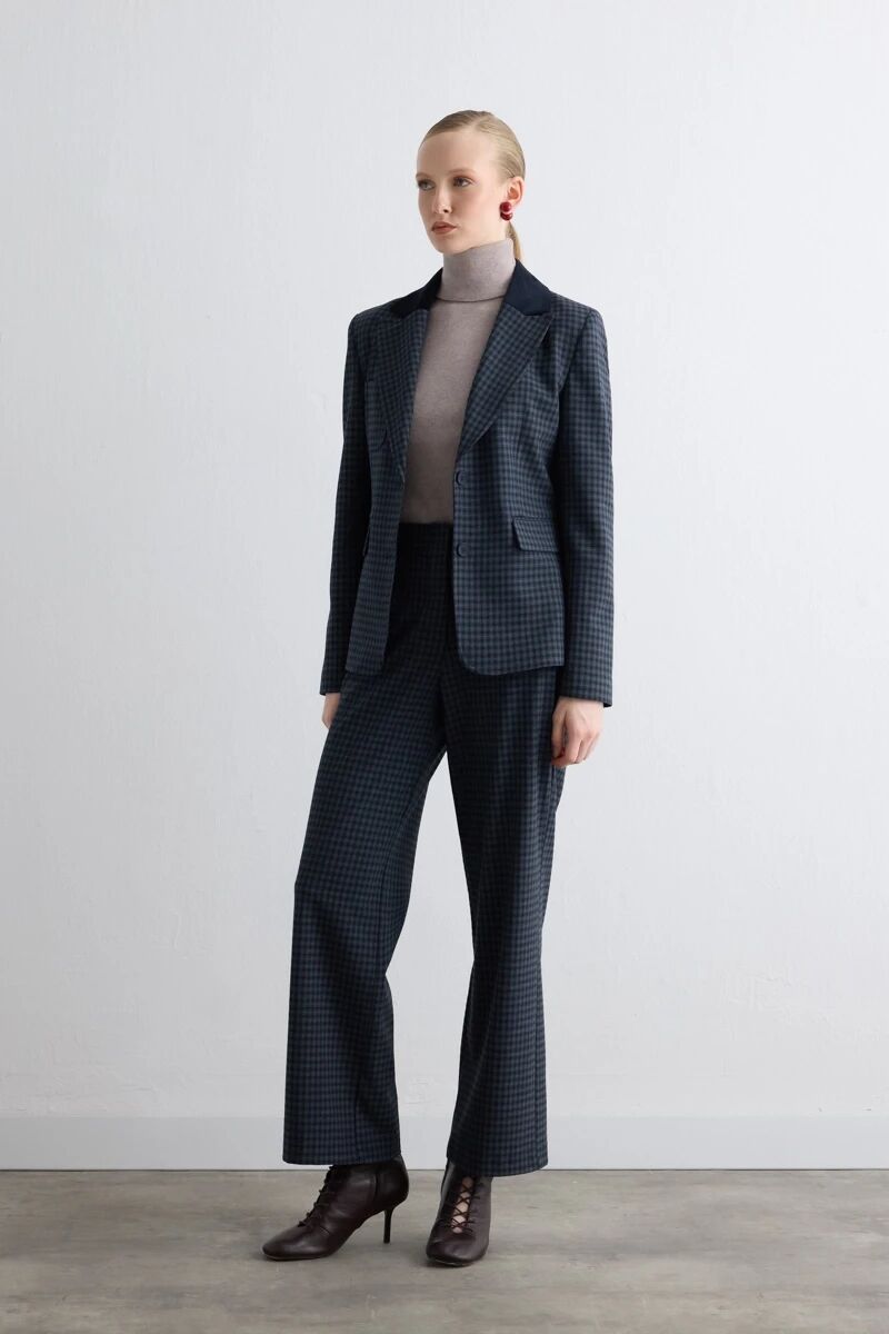 Kadife Yakalı Minik Ekose Ceket & Boru Paça Pantolon - Lacivert Takım