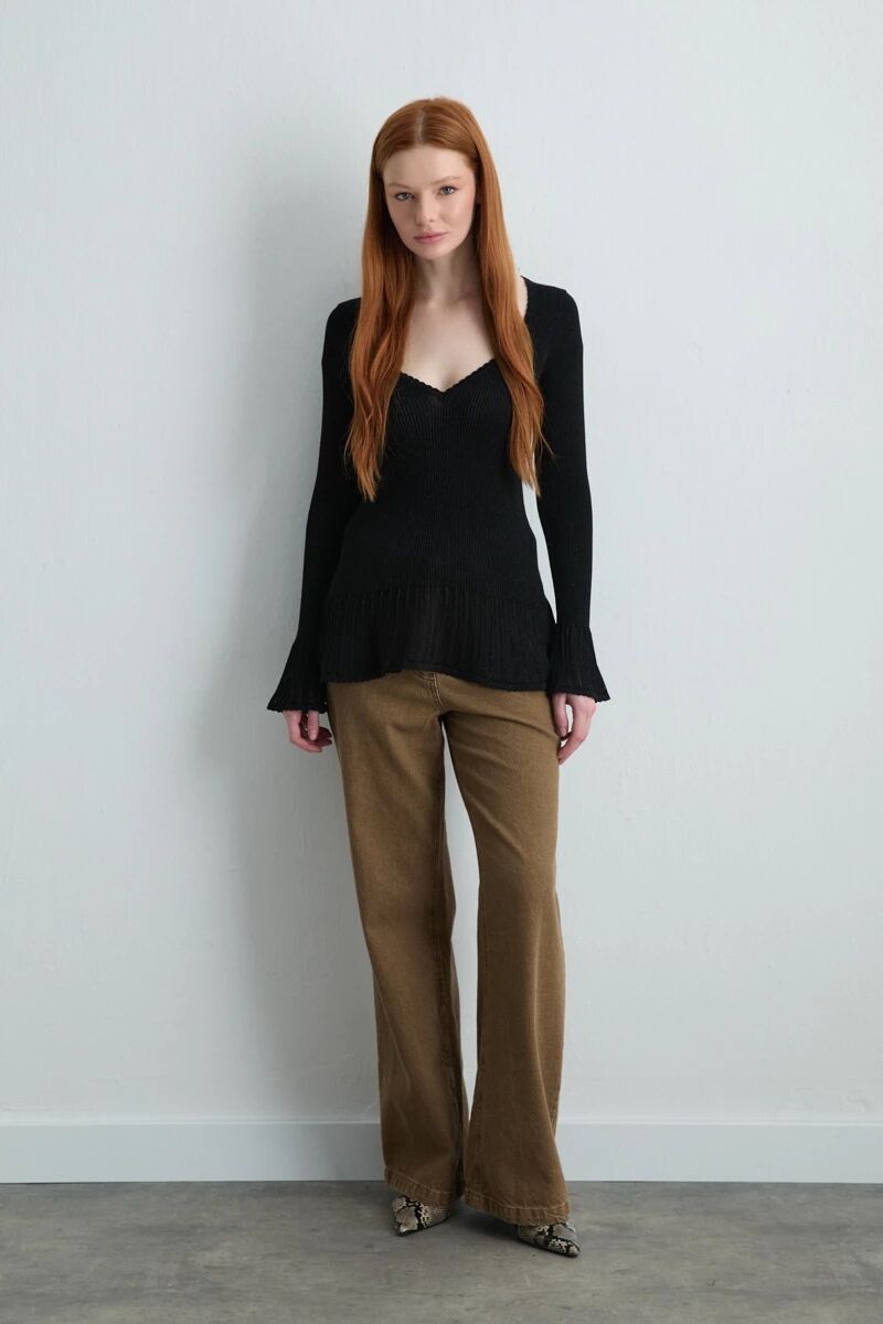 Kalp Yaka Fırfır Detaylı Triko Bluz - Siyah