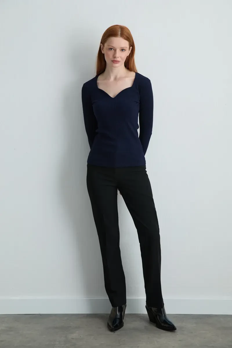 Sade ama etkileyici bir görünüm sunan lacivert kalp yaka pamuk bluz, zarif kesimiyle kadınsı bir siluet oluşturur. Yumuşak dokulu pamuklu yapısı gün boyu rahatlık sağlar. Hem jean hem eteklerle kolayca kombinlenebilir.