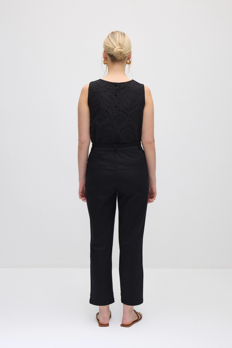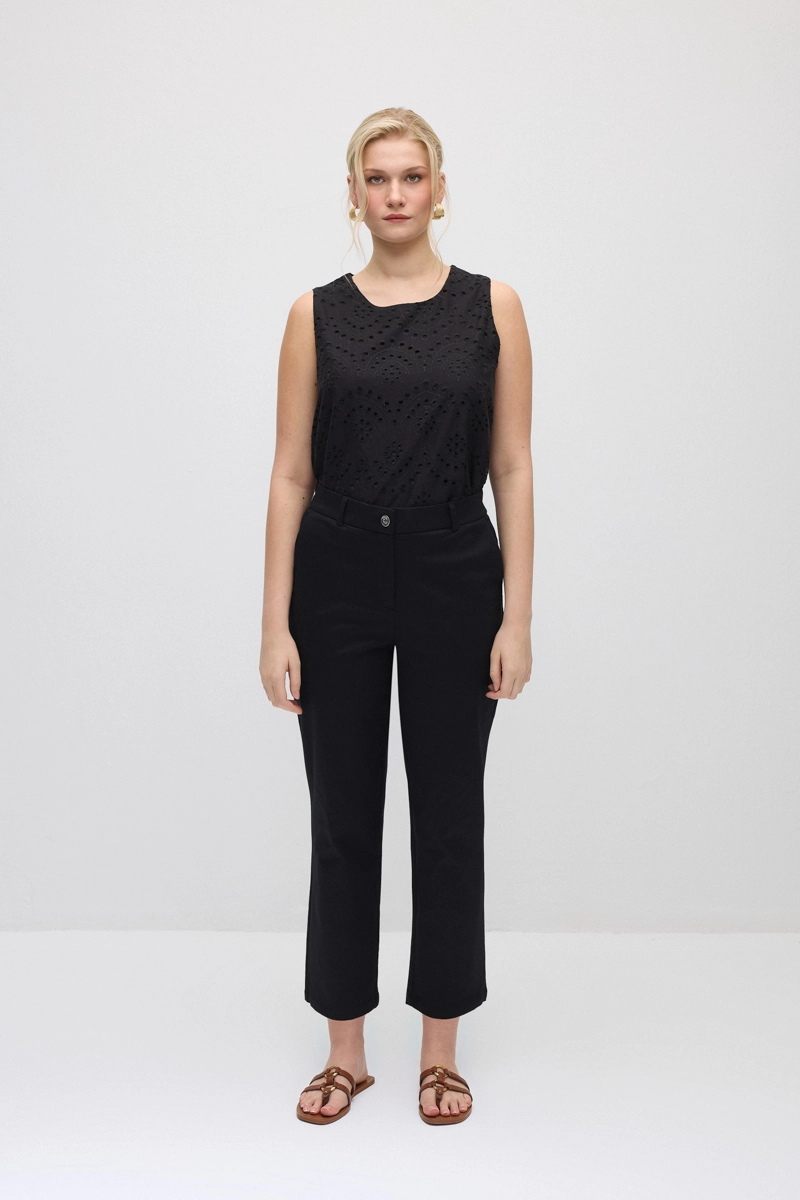 Mom kesimi rahat ve modern bir stil sunar. Kanvas kumaşı dayanıklı ve konforlu bir yapı sağlar. Siyah rengi klasik ve zamansız bir görünüm oluşturur. Günlük kombinlerde kolayca tercih edilebilir.