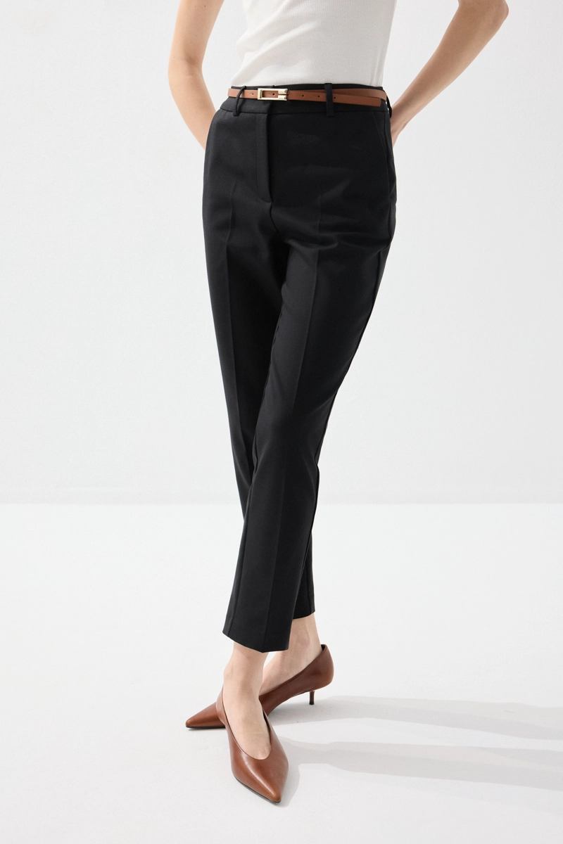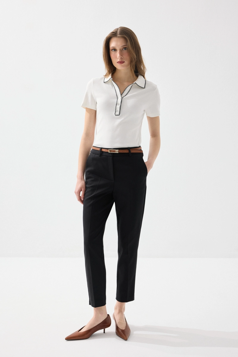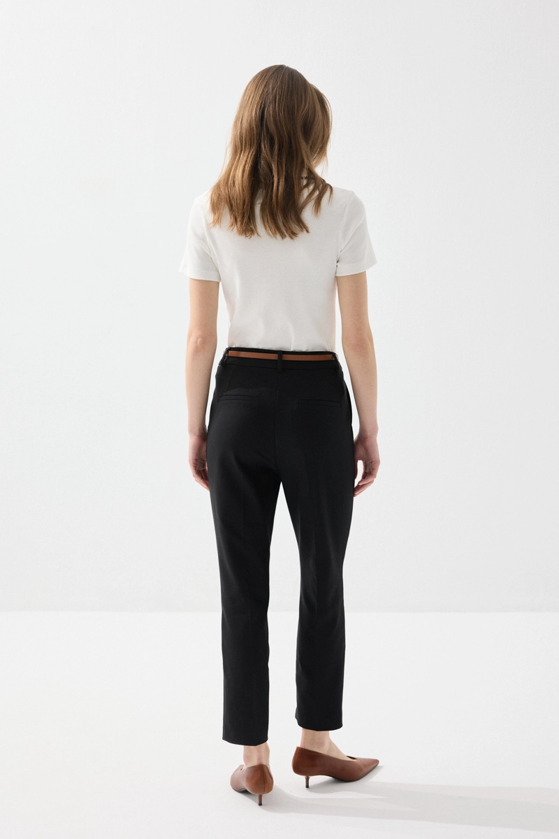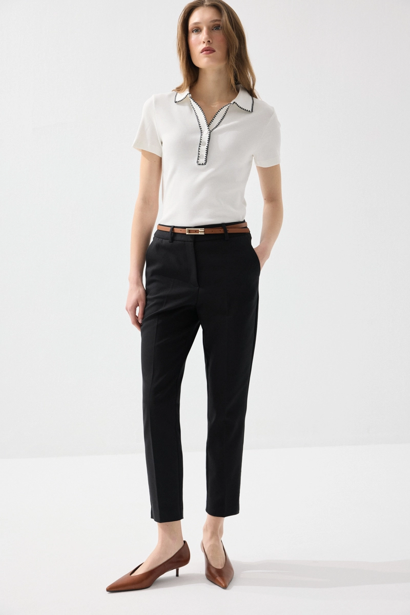 Klasik kesimiyle zarif ve düzenli bir görünüm sunar. Kemer detayı, bel hattını vurgulayarak dengeli bir siluet oluşturur. Koton kumaşı sayesinde gün boyu rahatlık sağlar. Siyah tonuyla her kombine kolayca uyum sağlar. Ofis stilinden günlük şıklığa kadar geniş kullanım sunar.