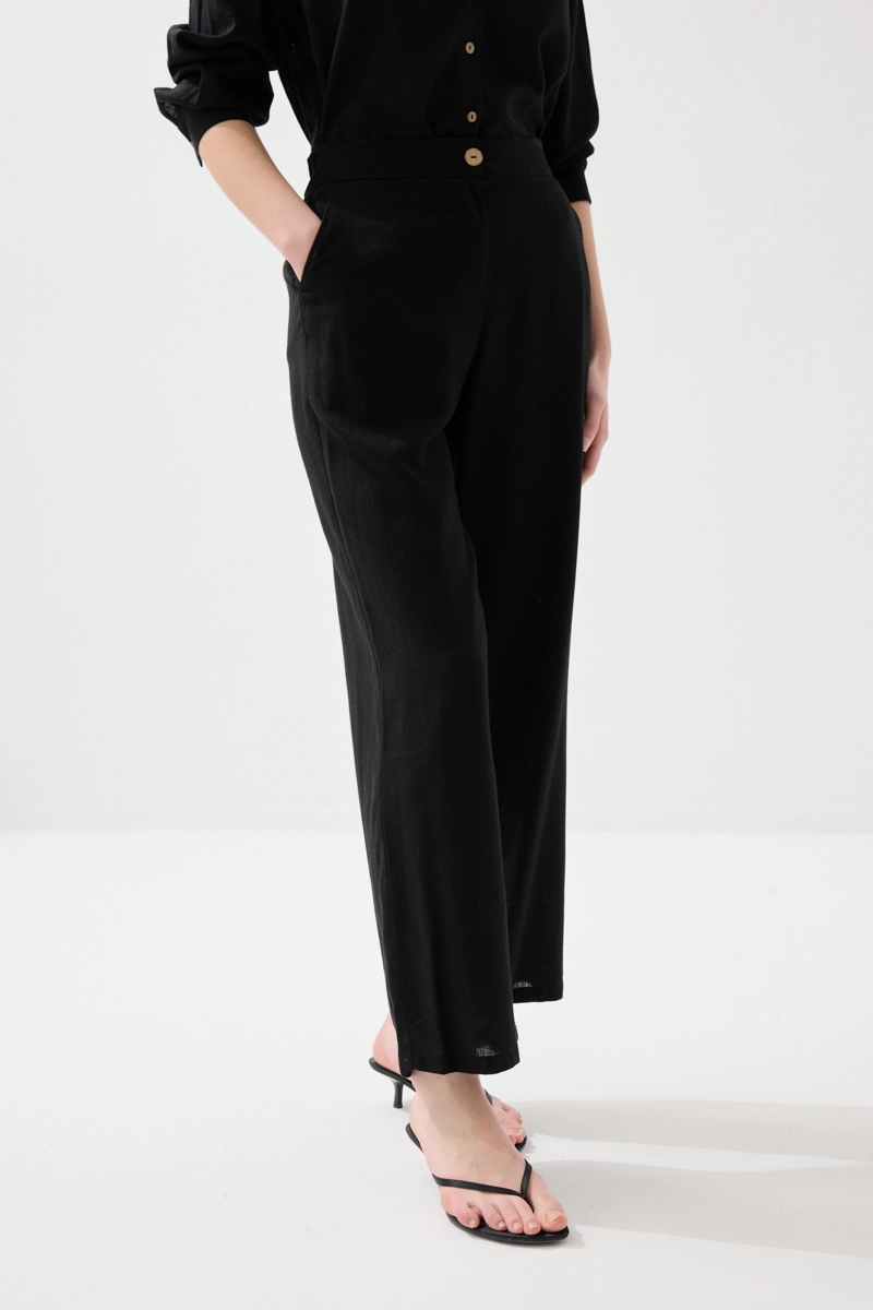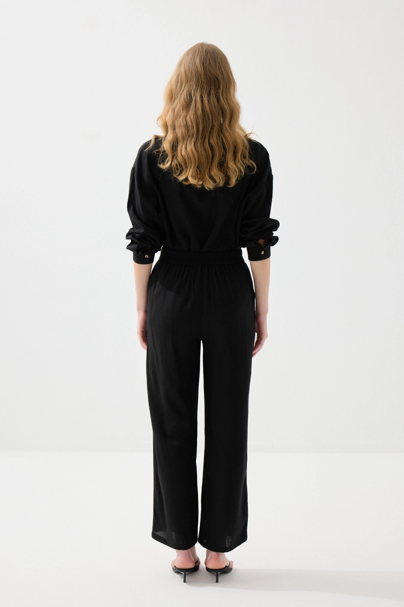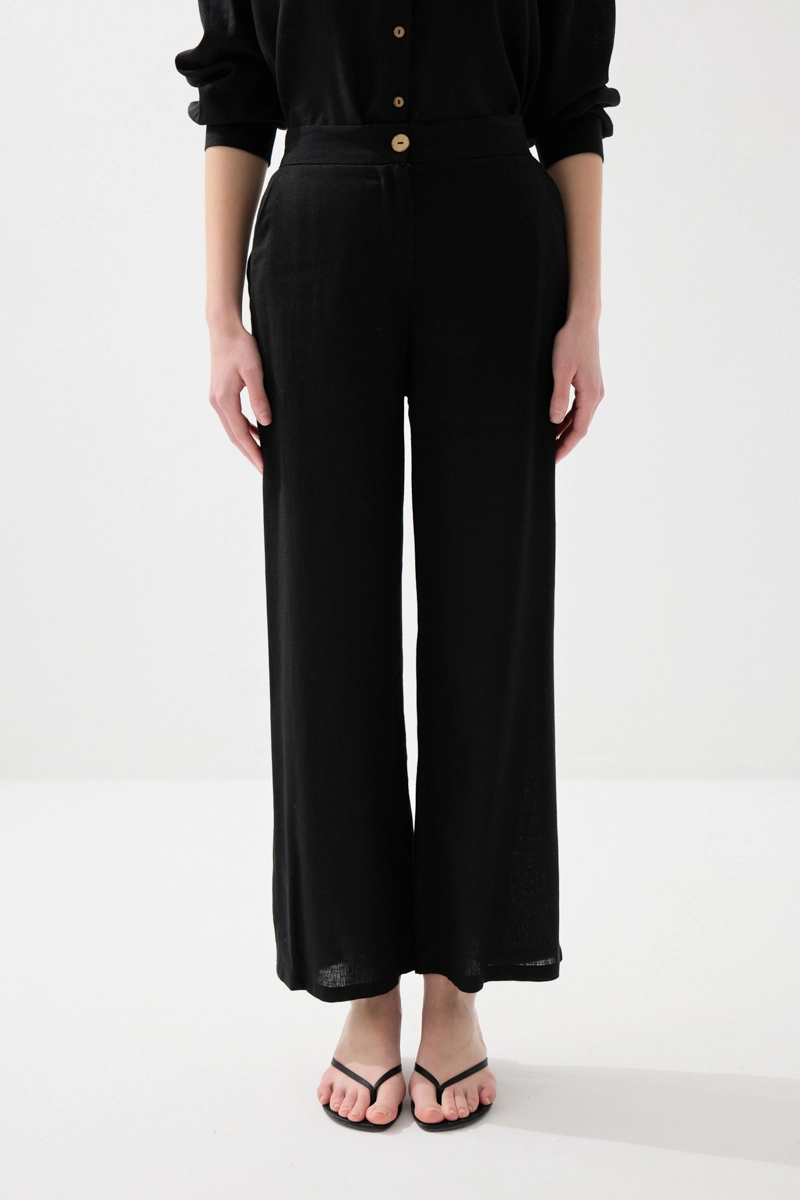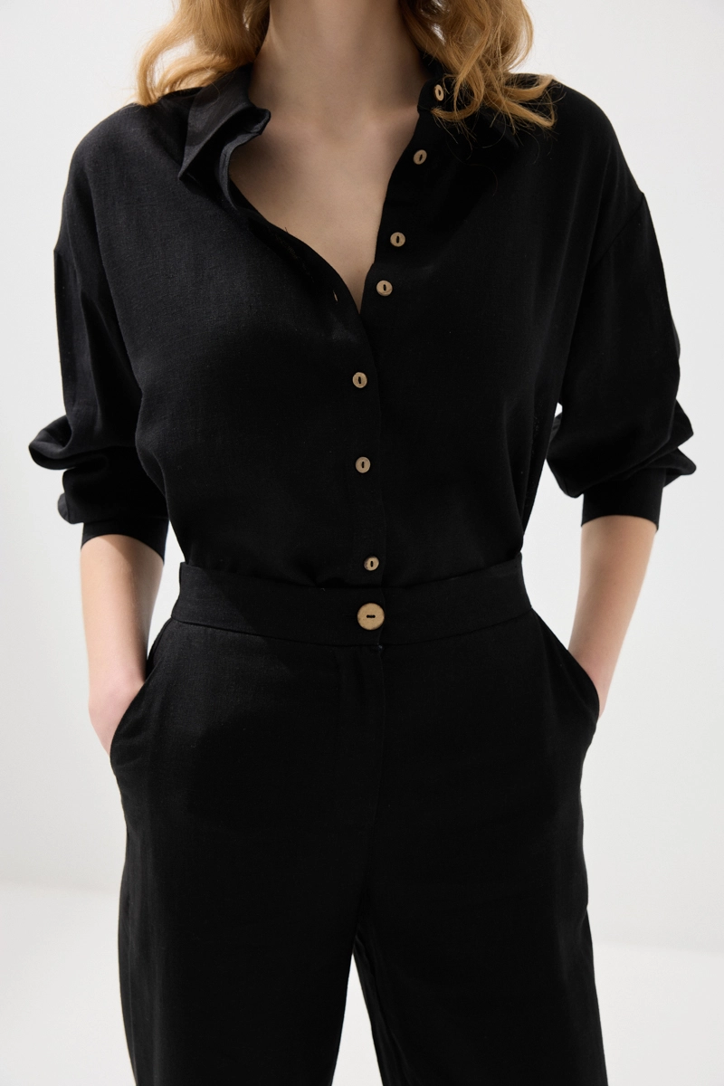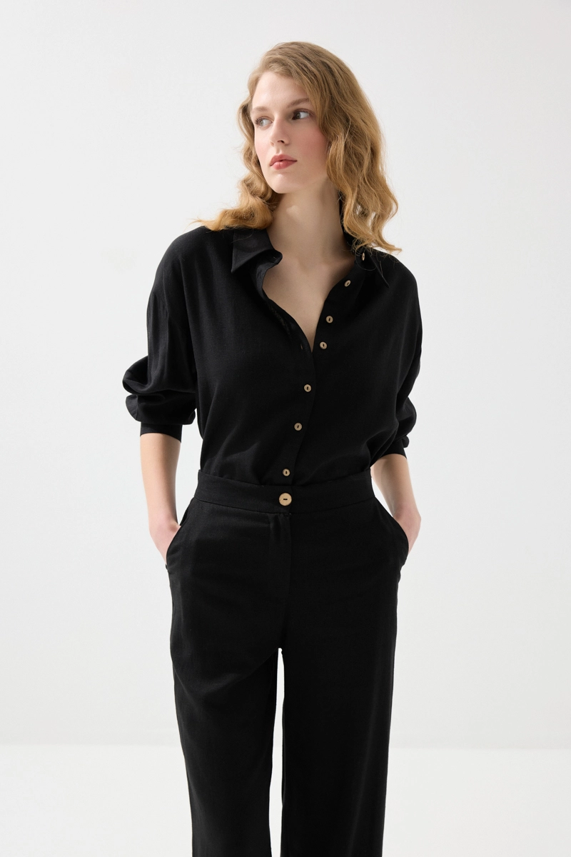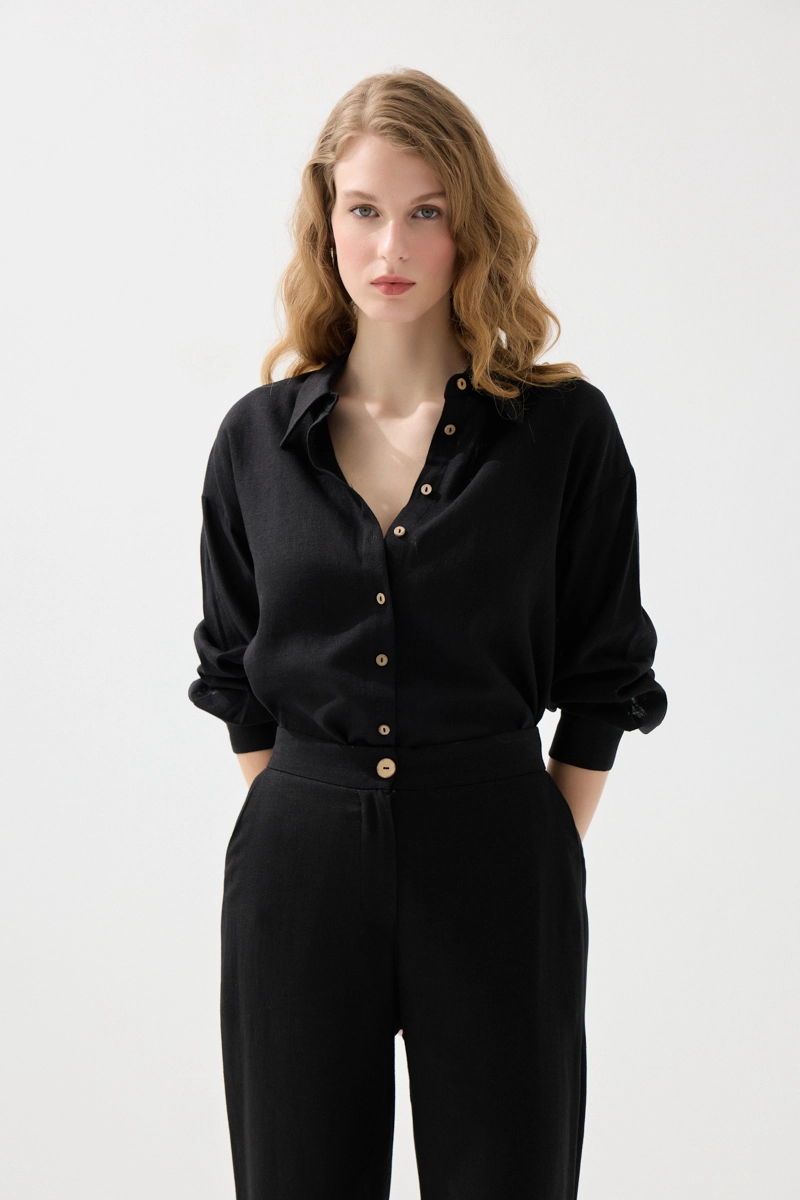 Klasik siyahın zamansız şıklığını doğal kumaş konforuyla birleştirir. Hafif yapısı sayesinde rahat bir kullanım sunar. Günlük ve şık kombinlerle kolayca uyum sağlar. Minimal tasarımıyla sade bir stil oluşturur. Her dolapta yer alması gereken temel parçalardan biridir.