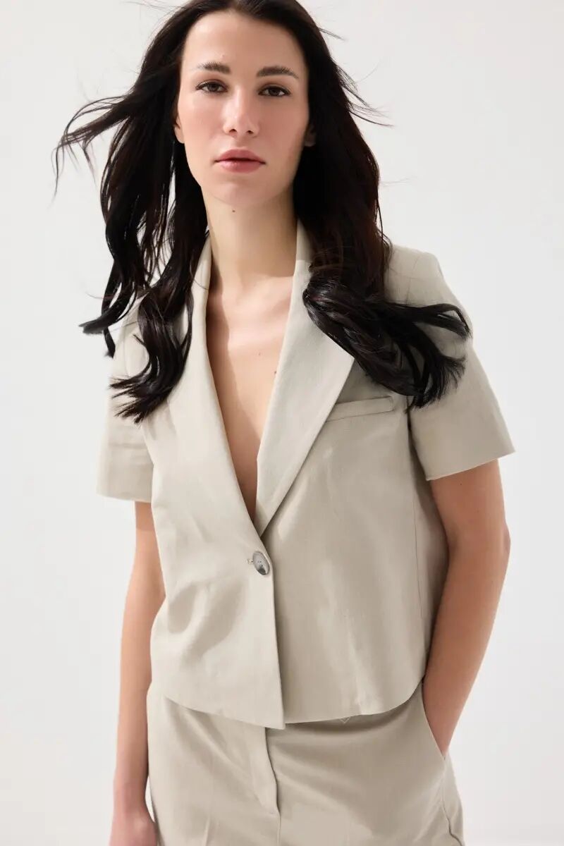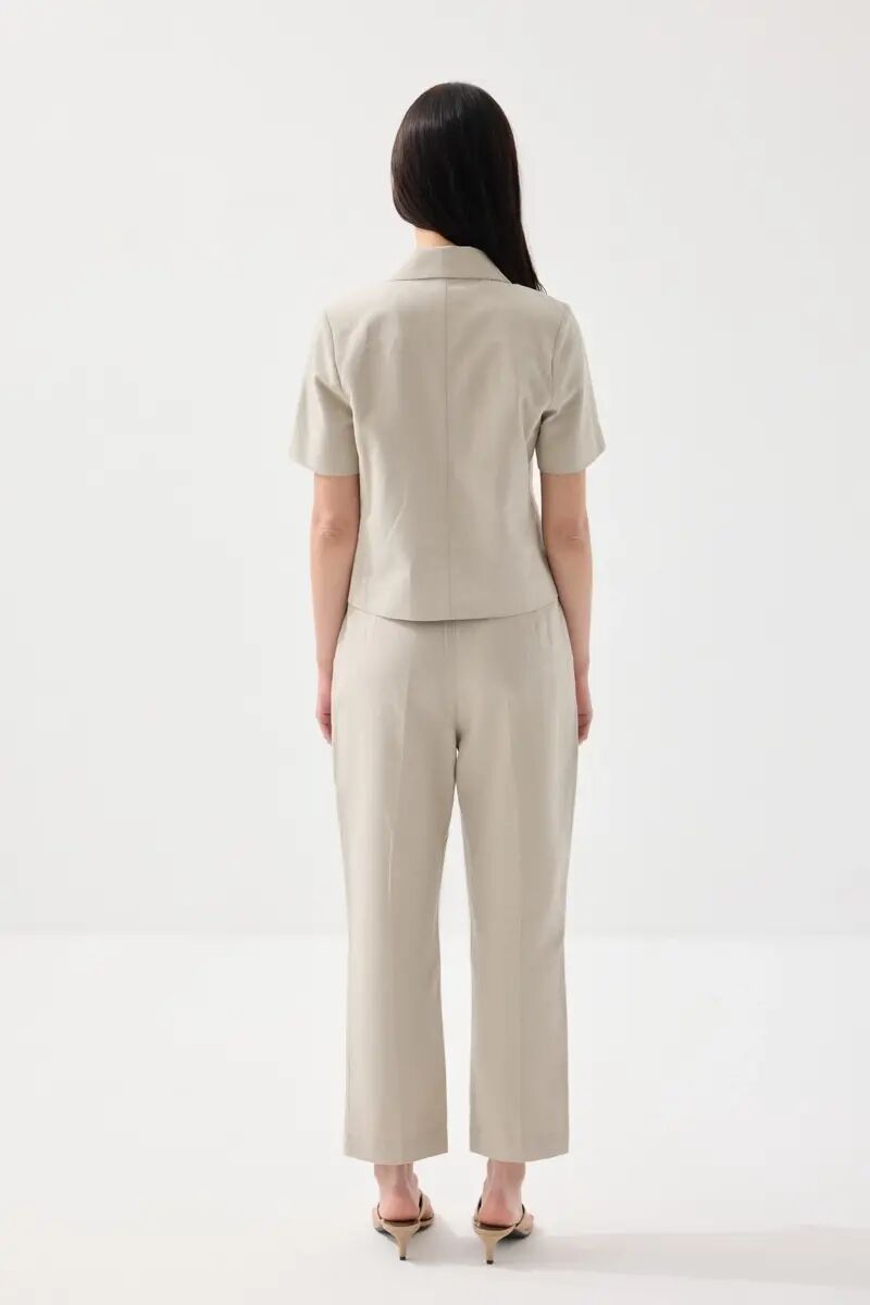 Kısa Keten Ceket & Pamuk Keten Havuç Kesim Pantolon Takım - Taş