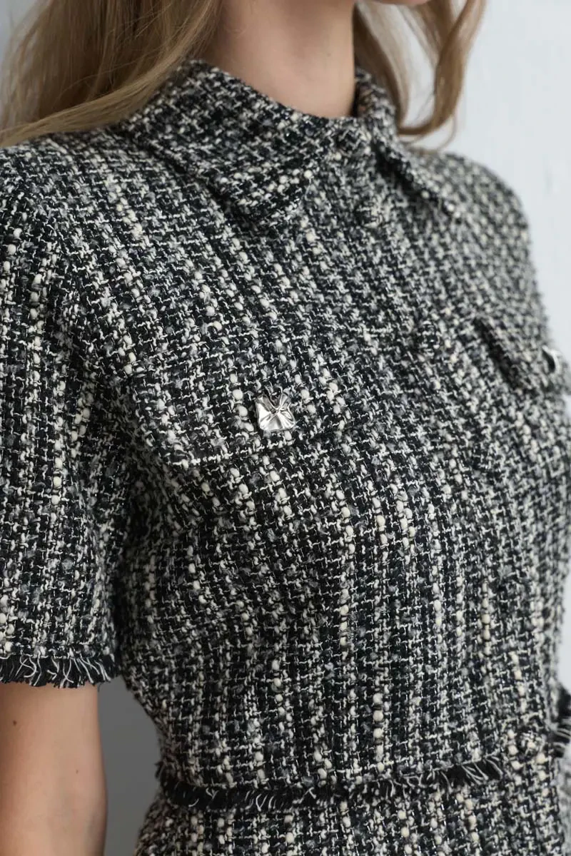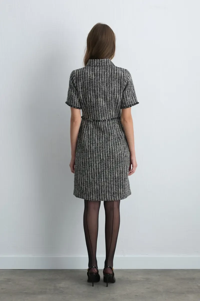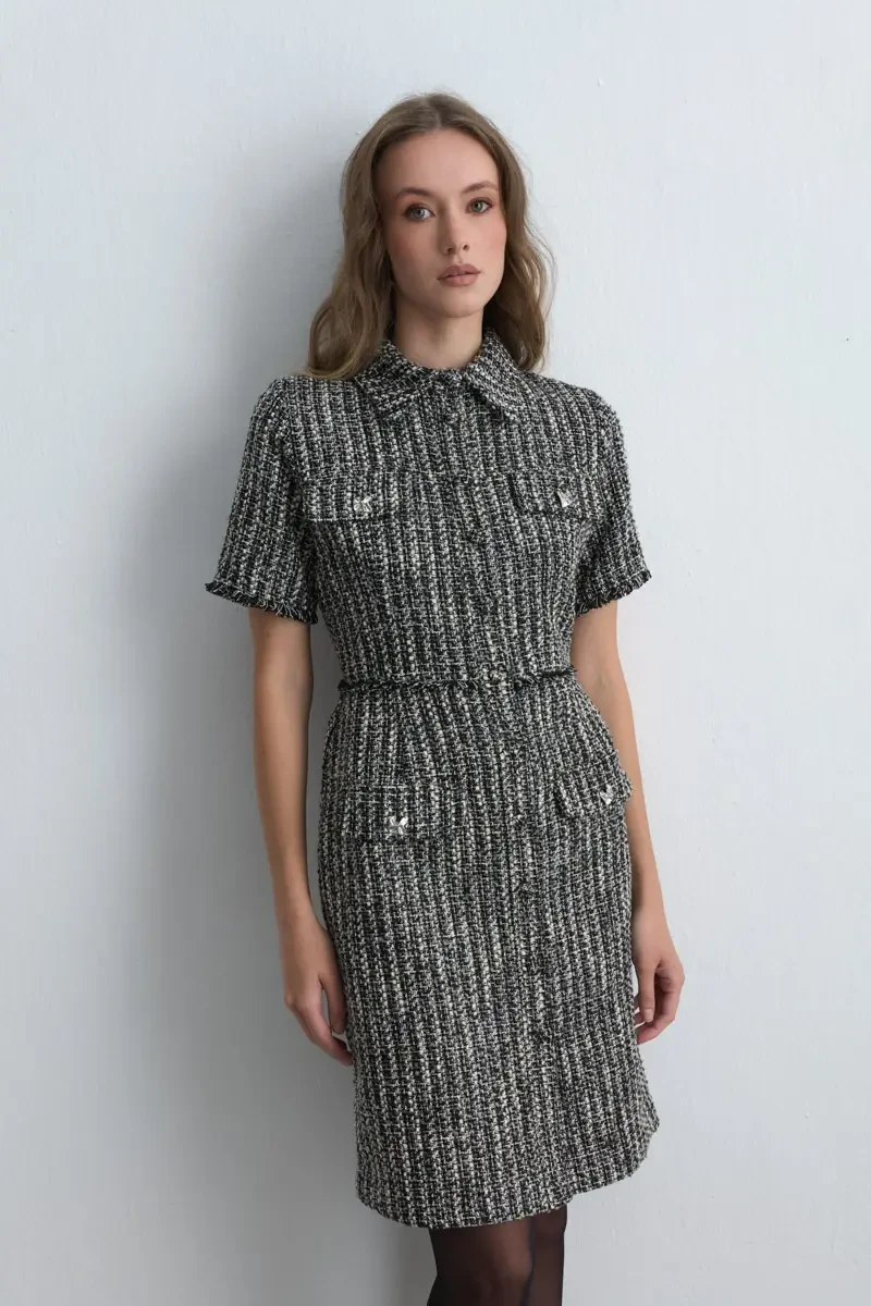 Şıklığı ön planda tutan bu tüvit elbise, bele oturan kesimiyle zarif bir siluet oluşturur. Siyah rengiyle zamansız bir seçenek olup özel günlerden iş hayatına kadar her ortamda kullanılabilir. Kısa kollu tasarımı modern bir hava katarken, klasik dokusuyla sofistike bir görünüm sunar. Minimal takılarla tamamlandığında elegan bir stil elde edilir.