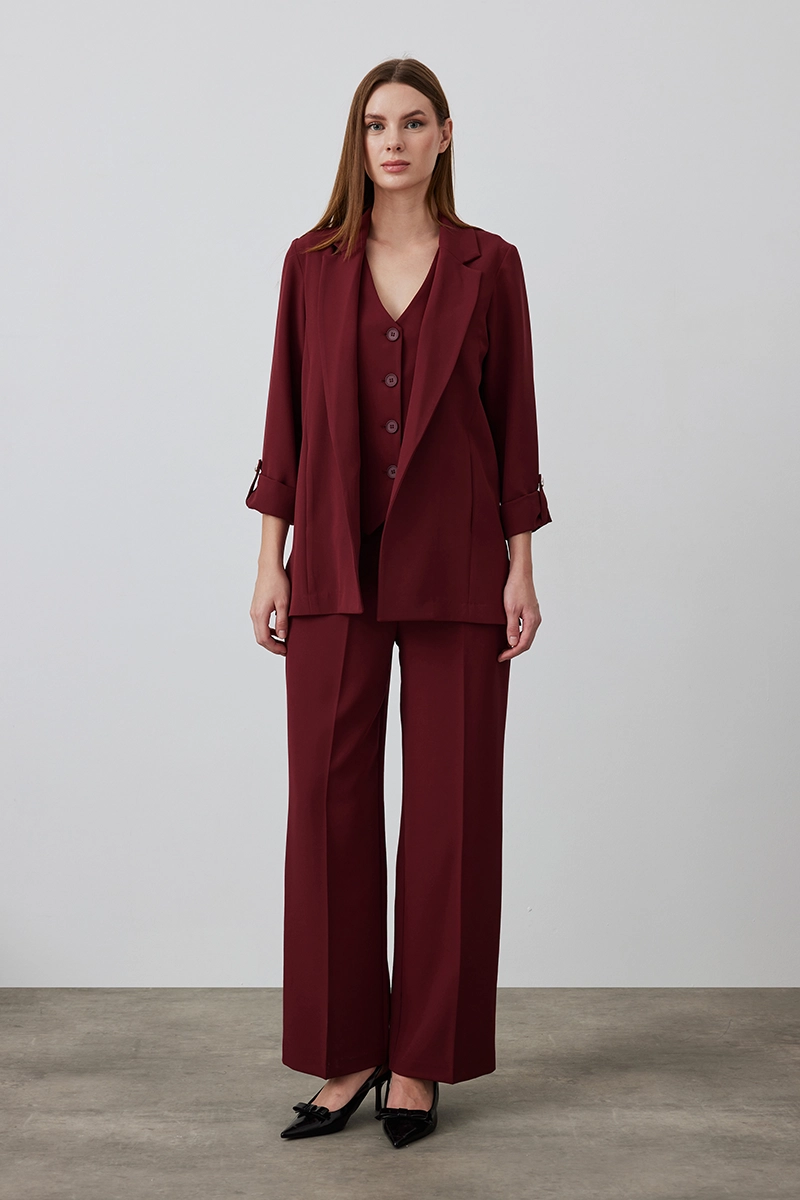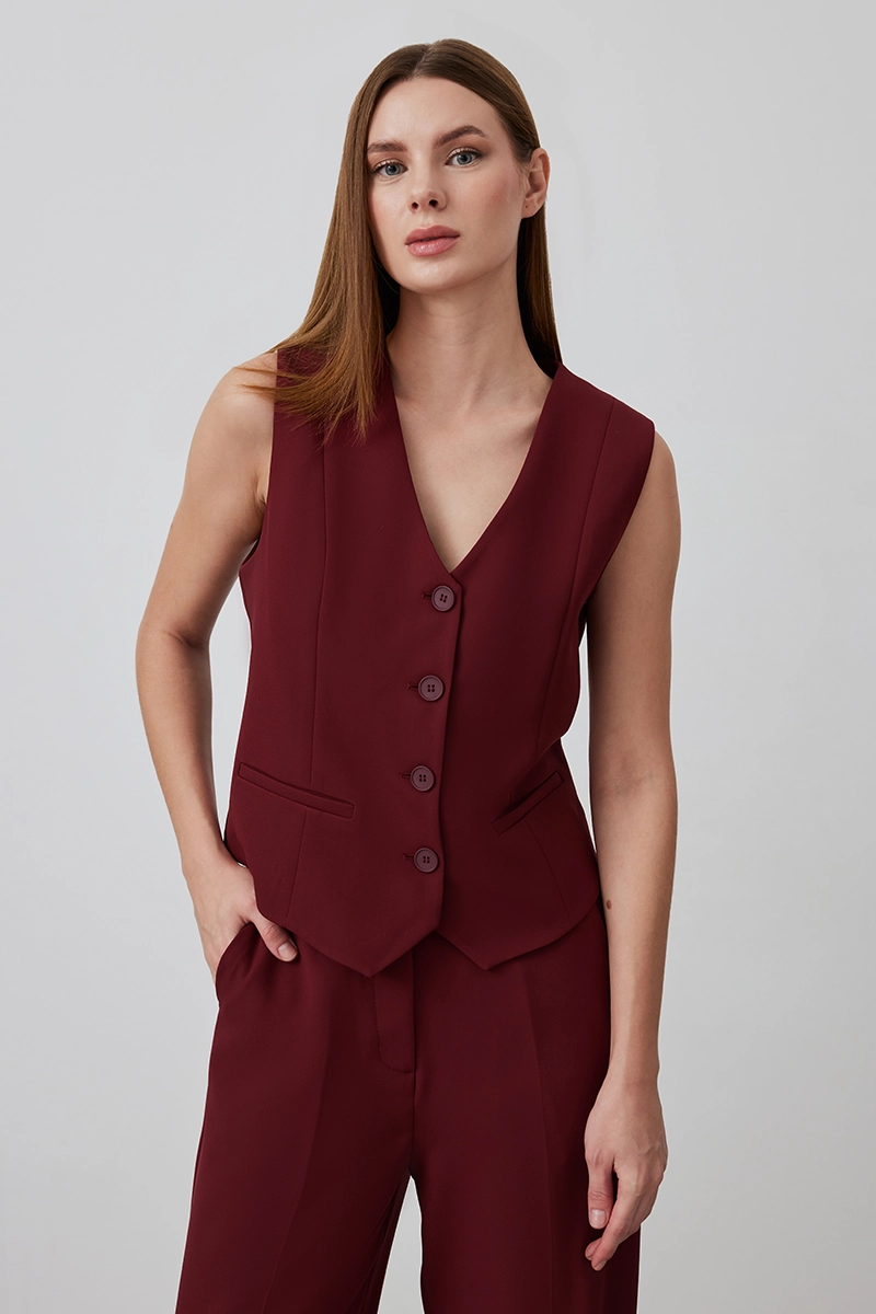 Bordo klasik kumaş yelek, sade tasarımı ve dengeli kesimiyle zamansız bir stil sunar. Şık ve düzenli kombinler için ideal bir parçadır.