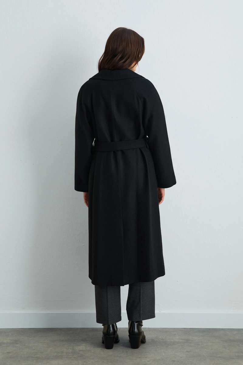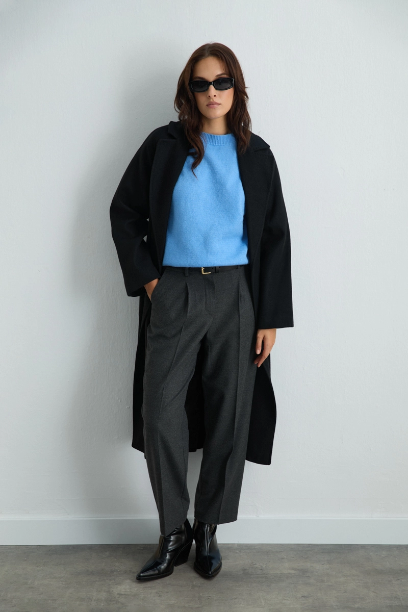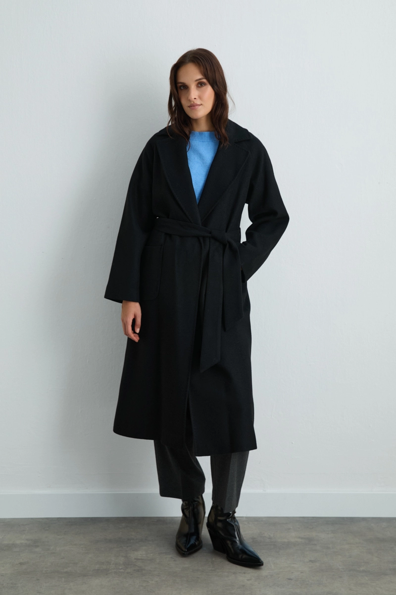 Zarif siyah rengi ve klasik kesimiyle her stile uyum sağlayan manto, kış aylarının vazgeçilmezi olur. Yumuşak ve sıcak tutan yünü sayesinde konforlu kullanım sunar. Minimal tasarımı, hem iş hem de günlük kombinlerde şıklığı ön plana çıkarır.