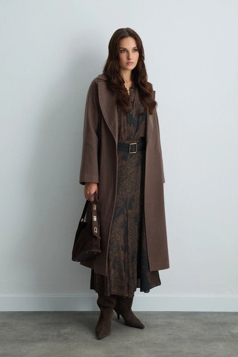 Yün Manto ve Kadife Yakalı Gömlek Uzun Etek Kombini