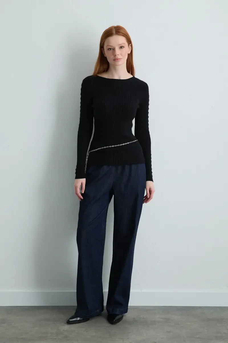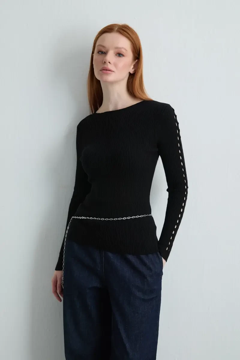 Siyah triko bluz, kollarındaki delik detaylarıyla modern ve şık bir tasarım sunar. Günlük kombinleri farklılaştıran bu parça, rahat ve esnek dokusuyla gün boyu konfor sağlar. Jean veya eteklerle kombinleyerek stilinize sofistike bir hareket katabilirsiniz.