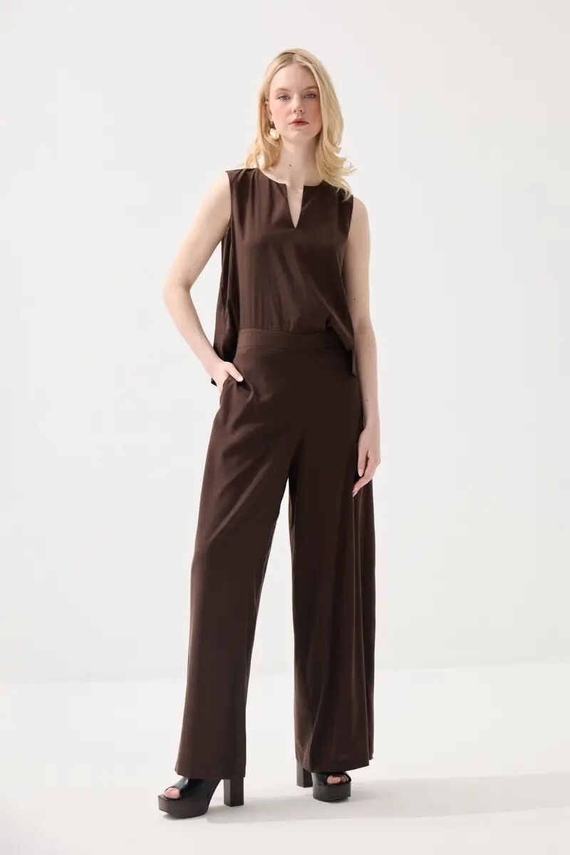 Kolsuz Bluz & Bol Paça Tencel Pantolon Takım - Kahverengi
