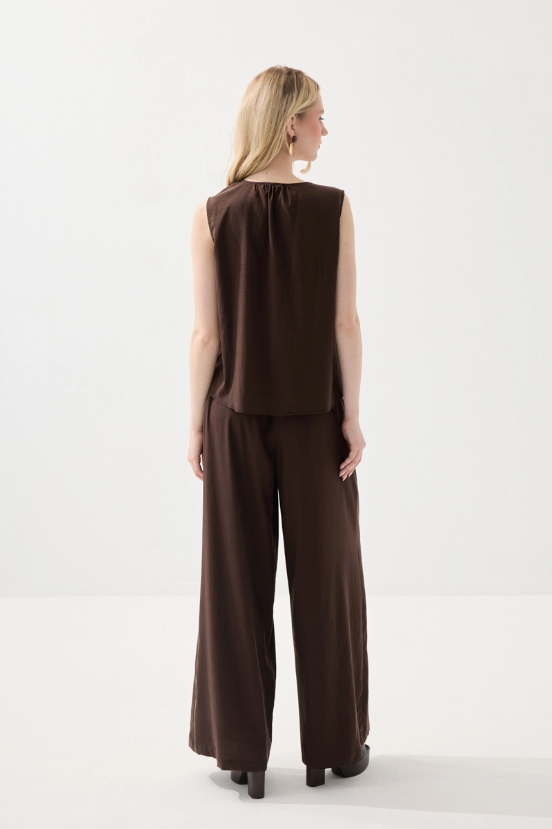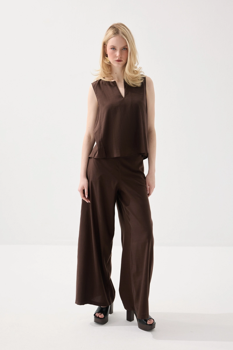 Tencel kumaşıyla yumuşak ve akışkan bir yapı sunar. Kolsuz tasarımı sayesinde ferah bir kullanım sağlar. Kahverengi tonu doğal ve sade bir stil oluşturur. Günlük kombinlerde rahatlıkla tercih edilebilir.