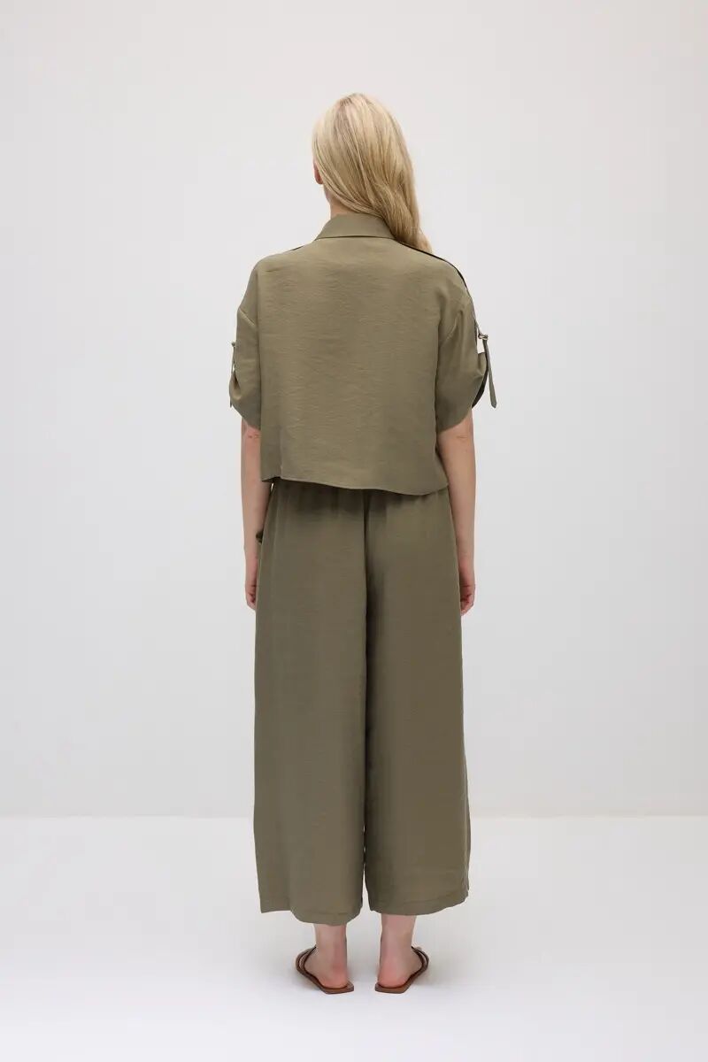 Kolu Apoletli Tencel Gömlek & Bol Paça Tencel Pantolon Takım - Haki