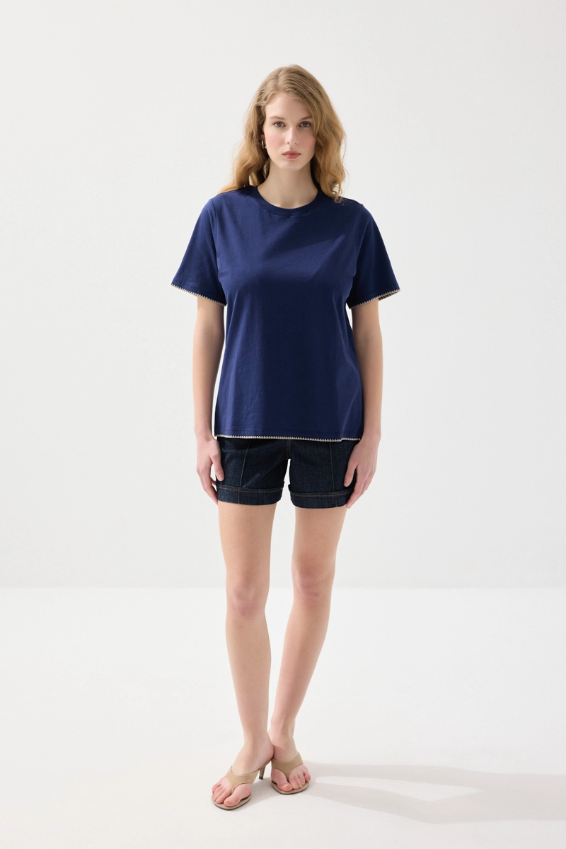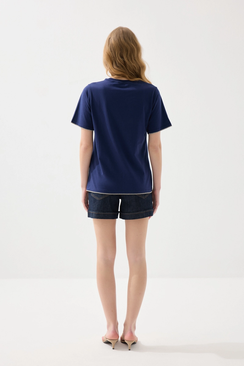 Kontrast nakışlarıyla dikkat çeken bu tasarım, stilinize özgünlük katar. Pamuklu dokusu gün boyu konfor sağlar. Lacivert tonu ile şık ve dengeli bir görünüm sunar. Günlük kombinlerde rahatlıkla tercih edilebilir. Sade ama etkileyici bir parçadır.