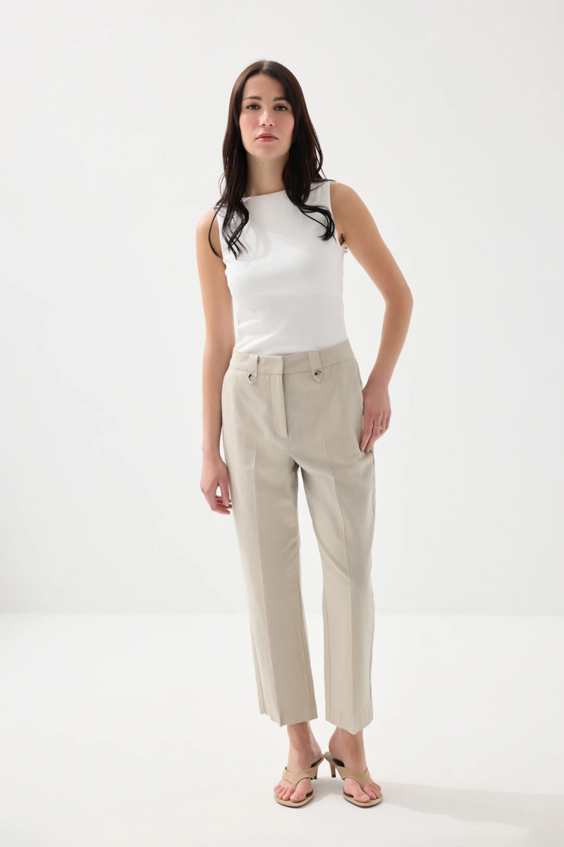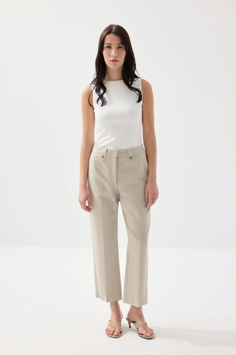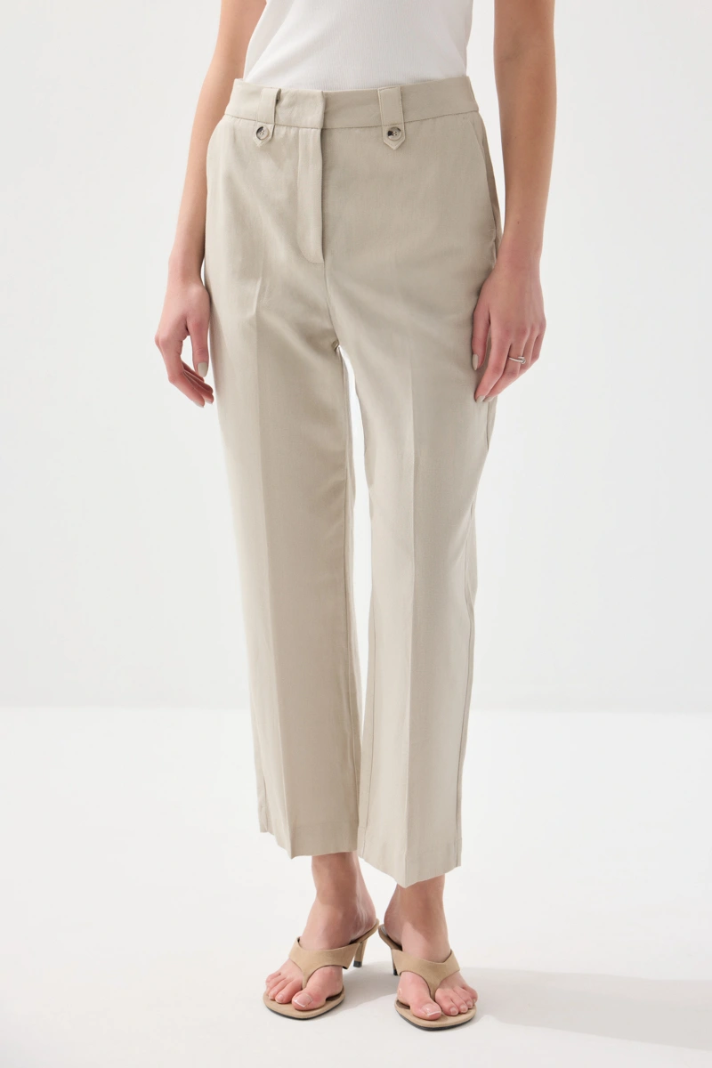 Doğal tonlarıyla sade ve zarif bir görünüm sunar. Havuç kesimi sayesinde modern bir stil oluşturur. Pamuk ve keten dokusu ile nefes alabilen ve hafif bir kullanım sağlar. Günlük kombinlerde konforlu bir tercih sunar. Şıklığı minimal detaylarla tamamlar.