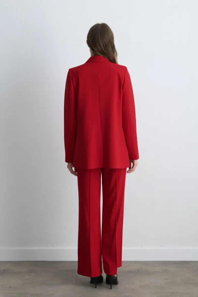 Kırmızı tonu cesur ve iddialı bir şıklık sunar. Krep dokusu modern bir akışkanlık kazandırır. Blazer kesimi stil sahibi bir görünüm oluşturur. Günlük şıklıkta ve davetlerde öne çıkar.