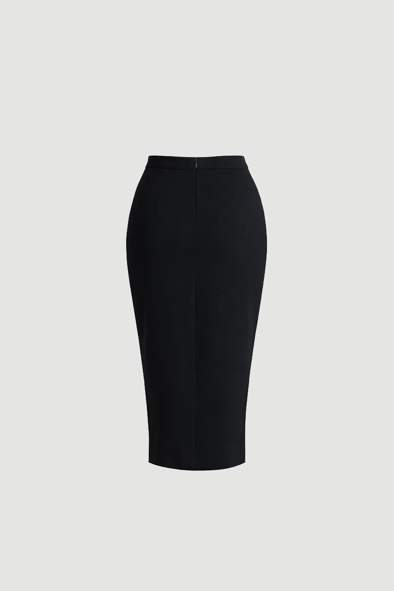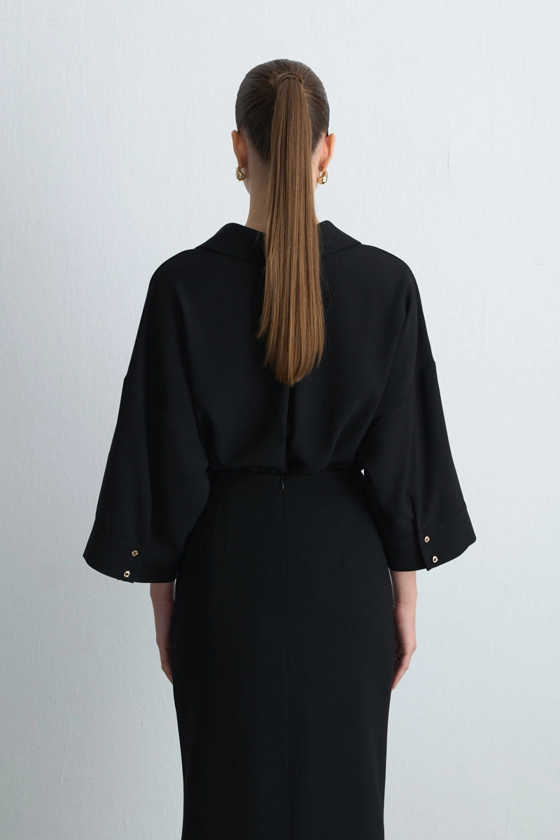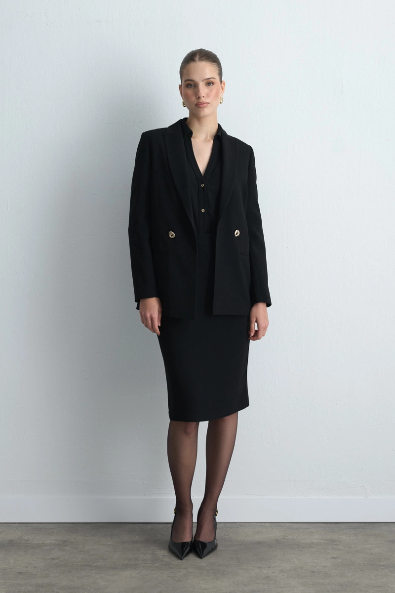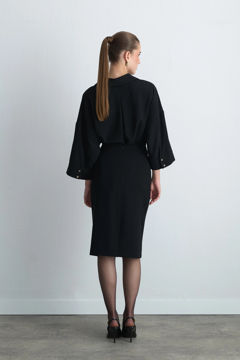 Crepe Fabric Provides Graceful Fluidity. Pencil Form Creates A Feminine Silhouette. The Black Tone Offers Timeless Elegance. It Stands Out In Both Office Outfits And Special Occasions.