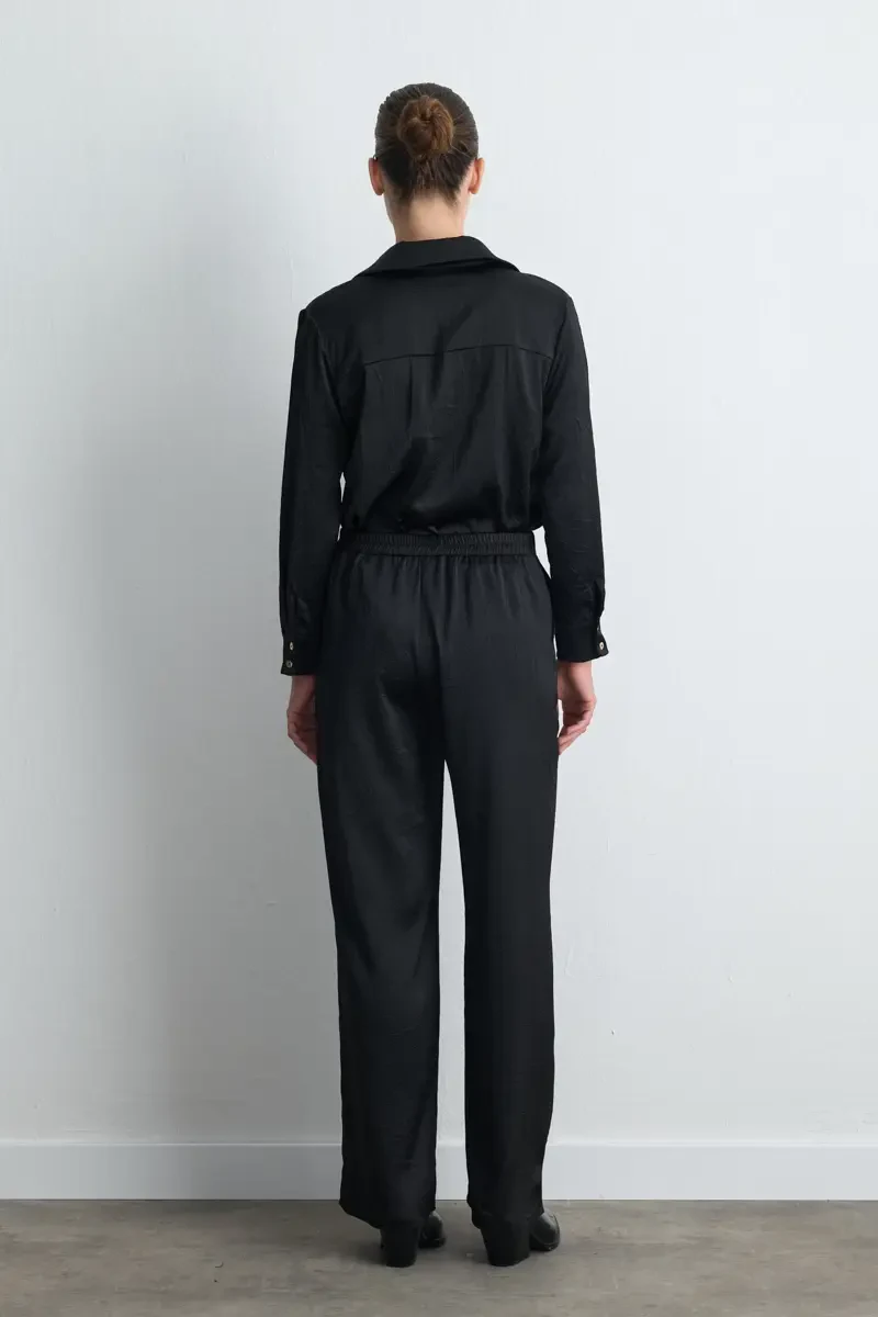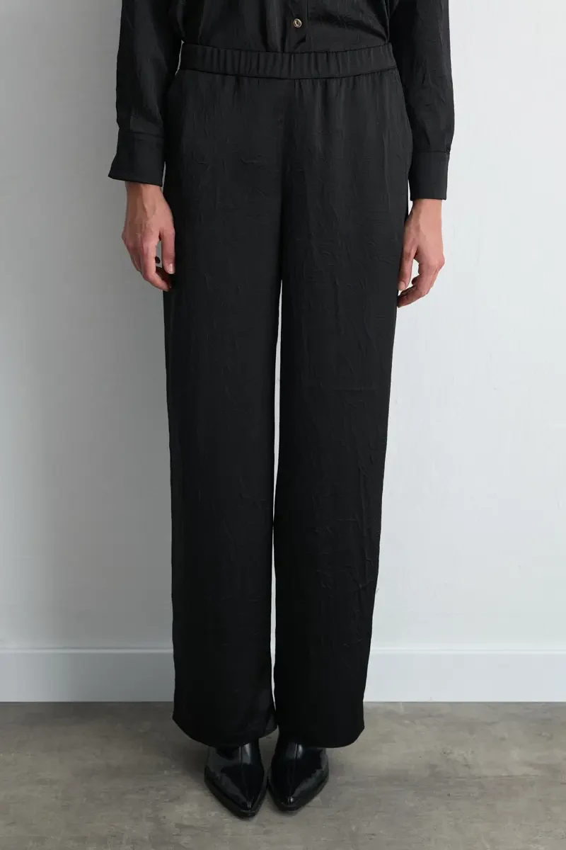 Siyah tonu klasik ve modern bir stil sunar. Krinkıl saten dokusu hafif parlaklık ve zarif bir görünüm kazandırır. Bol paça kesimi rahat ve hareketli bir siluet oluşturur. Düz formu minimal ve şık bir duruş sağlar. Günlük ve özel kombinlerde stilin öne çıkan parçalarından biridir.
