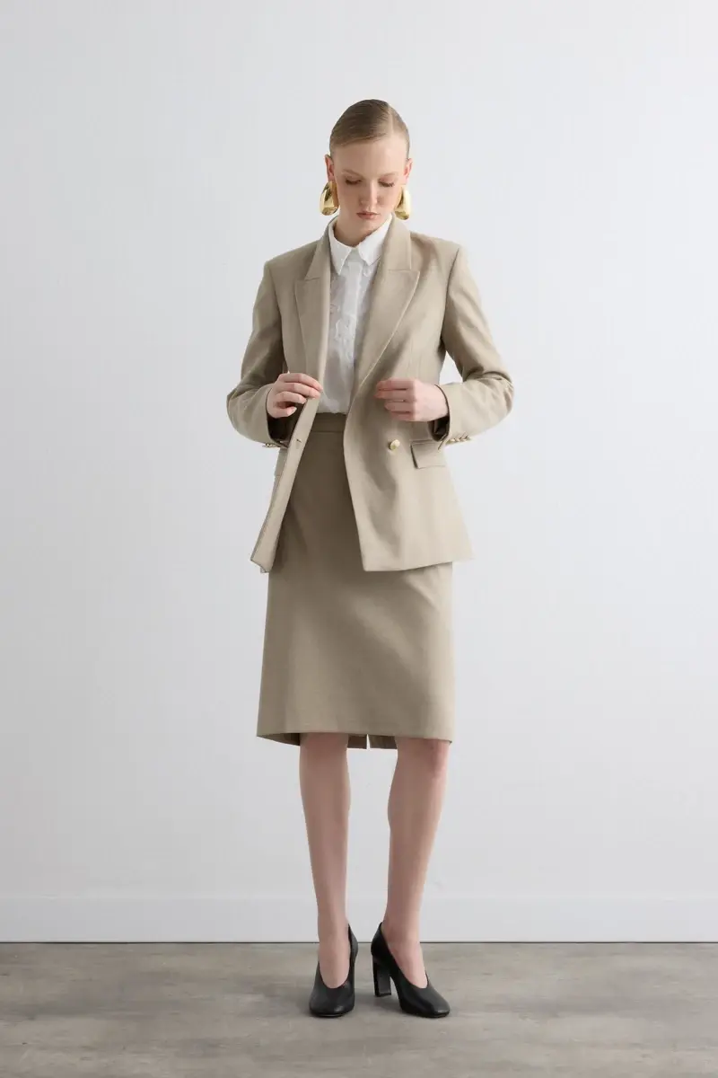 Double-Breasted Cashmere Jacket with Cashmere Pencil Skirt - Beige