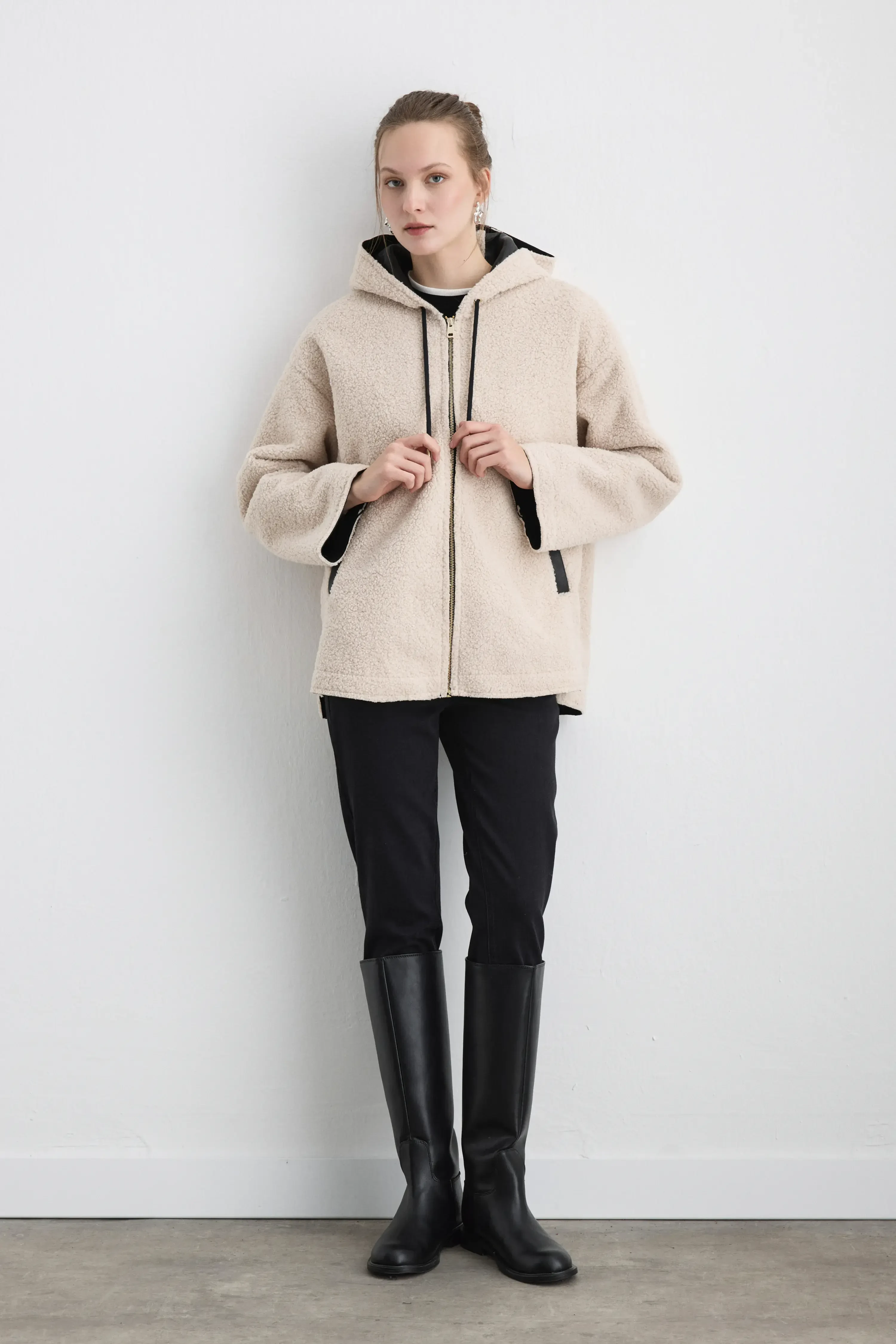 The soft teddy texture gives a warm feel, while the leather details inside create a modern contrast. The hood design adds a sporty touch. It combines comfort and style on cold days.