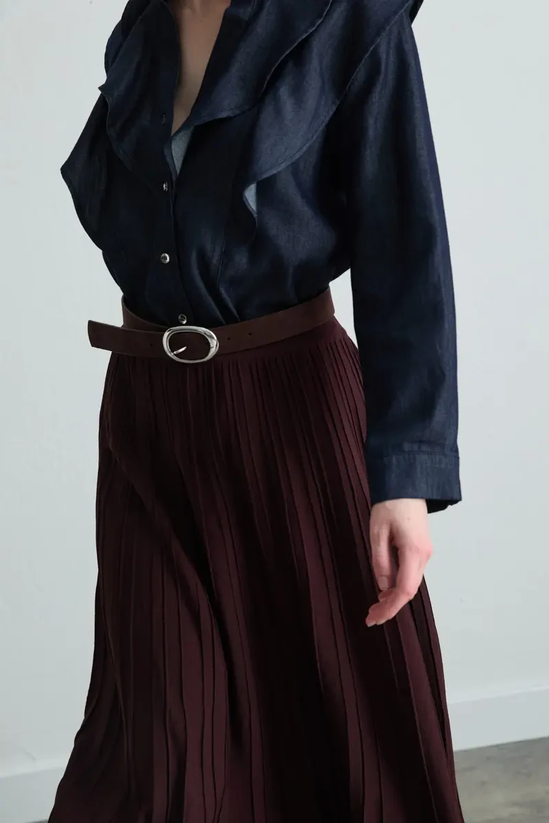 This brown knit skirt with pleated details offers a feminine look, blending classic and modern styles. Its stretchy knit fabric provides comfort, while the long length creates an elegant silhouette. Pairs perfectly with basic blouses or knit tops.