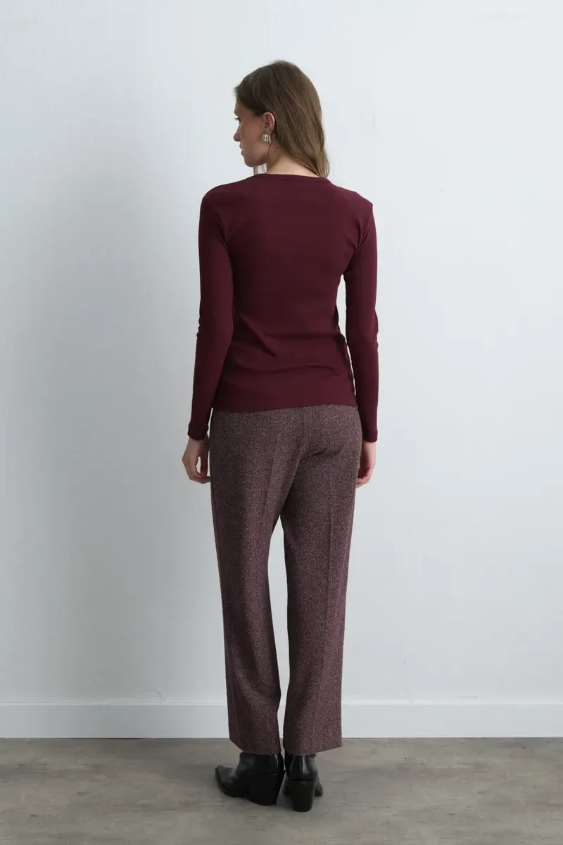 Combining comfort and subtle elegance, the long-sleeved burgundy cotton T-shirt becomes an indispensable piece for daily outfits. It can be easily paired with various bottoms and provides all-day ease.