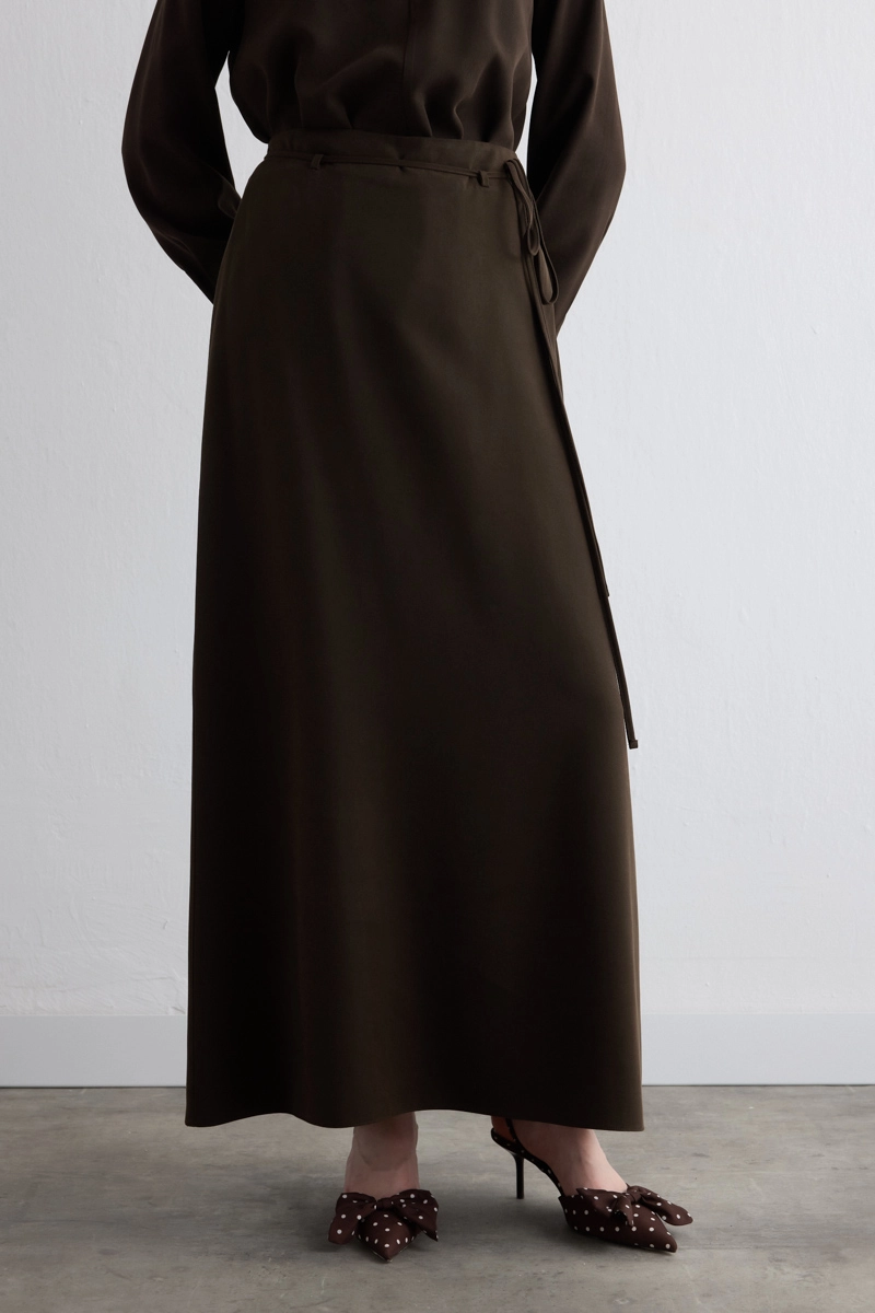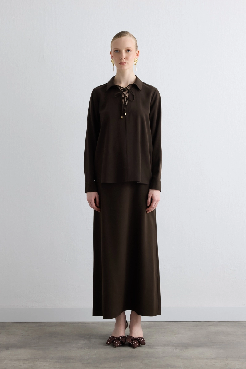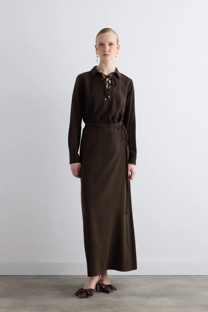 The natural lyocell fabric is breathable and comfortable. Its long form provides an elegant silhouette. The brown tone gives a warm and sophisticated look. Easily adapts from daily wear to elegant evening outfits.