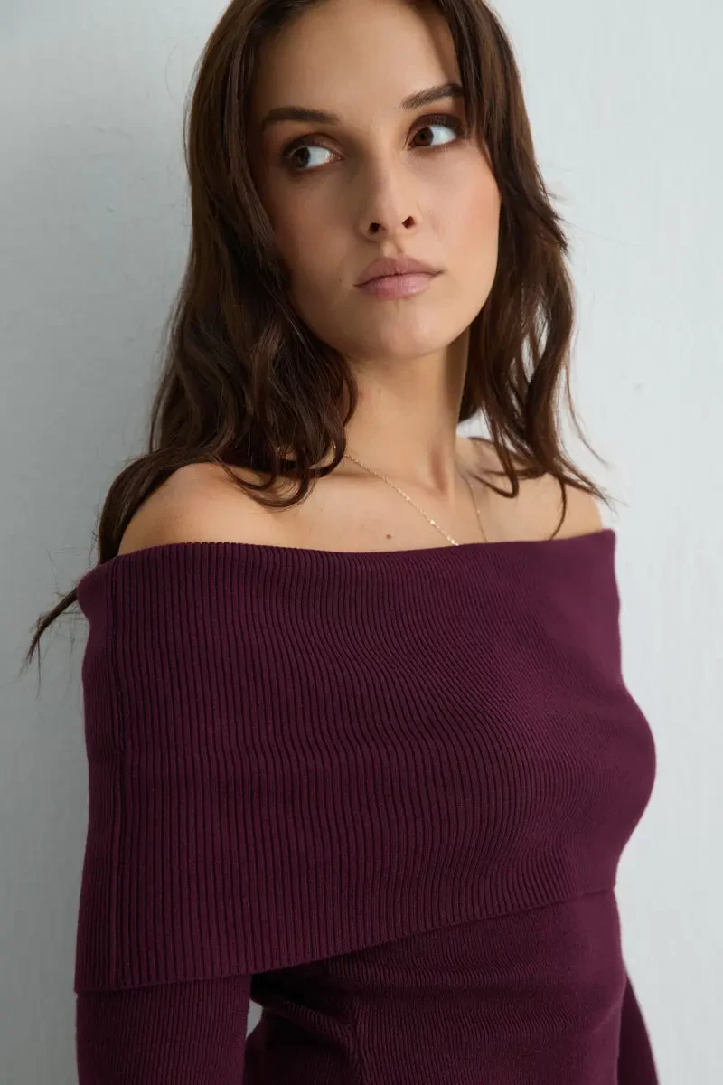 Mürdüm rengi ve madonna yaka tasarımıyla öne çıkan bluz, klasik ve modern kombinlere sofistike bir dokunuş katar. Yumuşak triko dokusu, gün boyu rahat kullanım sunar. Farklı alt parçalarla kombinlenerek stilinize zarif bir hareket kazandırır.