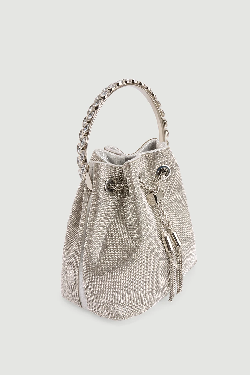 Parlak taş işlemeleriyle zarif bir ışıltı sunar. Gümüş tonu modern ve dikkat çekici bir hava kazandırır. Metal askısıyla elde ya da omuzda rahatlıkla taşınabilir. Abiye kombinlere zarafet katar.