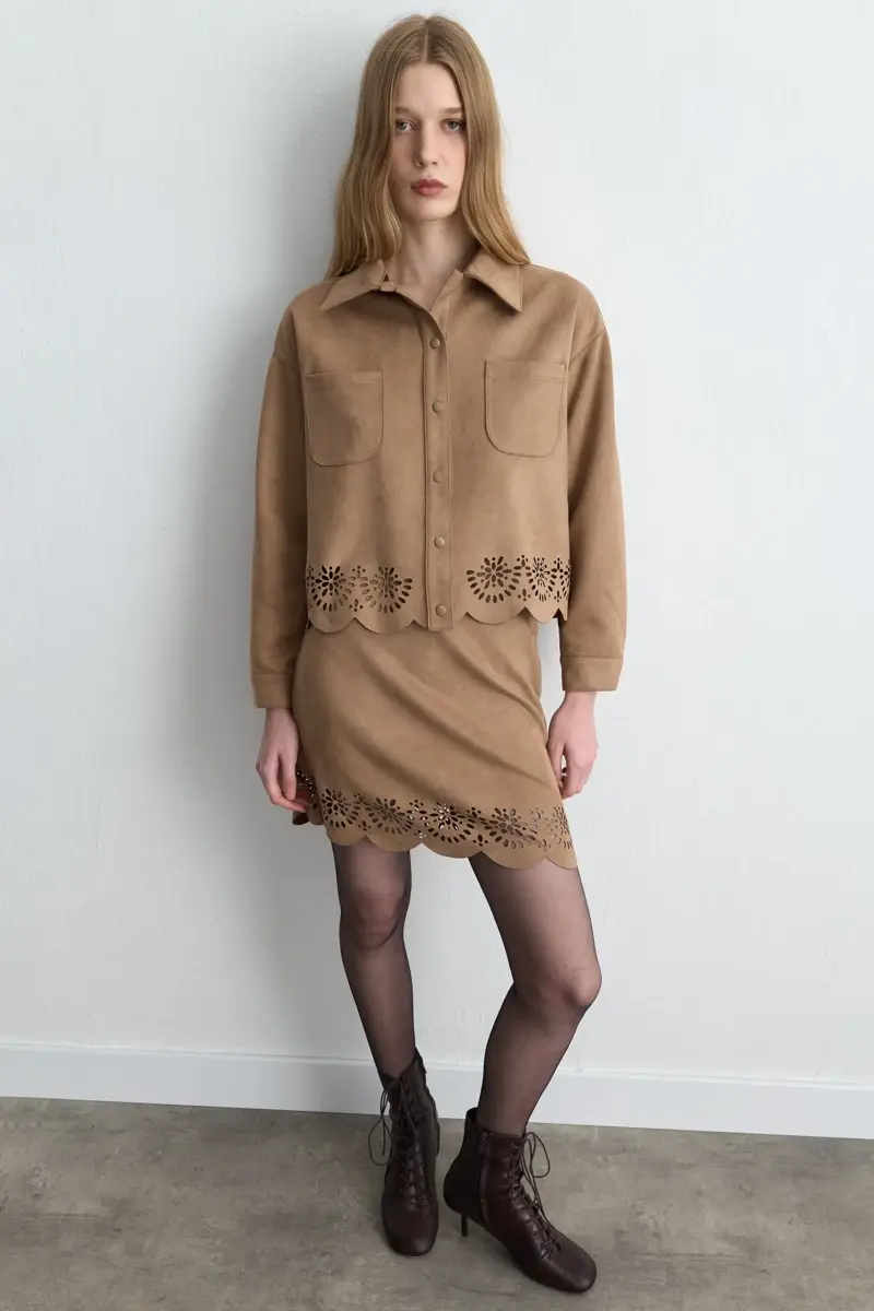 Motifli Süet Gömlek Ceket & Etek - Camel Takım