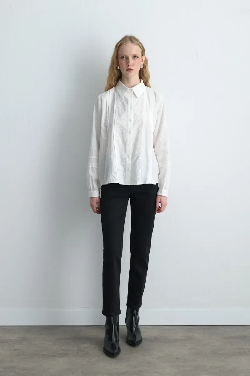 Nakış detayı romantik ve zarif bir dokunuş katar. Pamuklu yapısı nefes alarak konfor sunar. Beyaz tonu temiz ve sofistike bir görünüm sağlar. Günlük kombinlerin öne çıkan parçalarındandır.