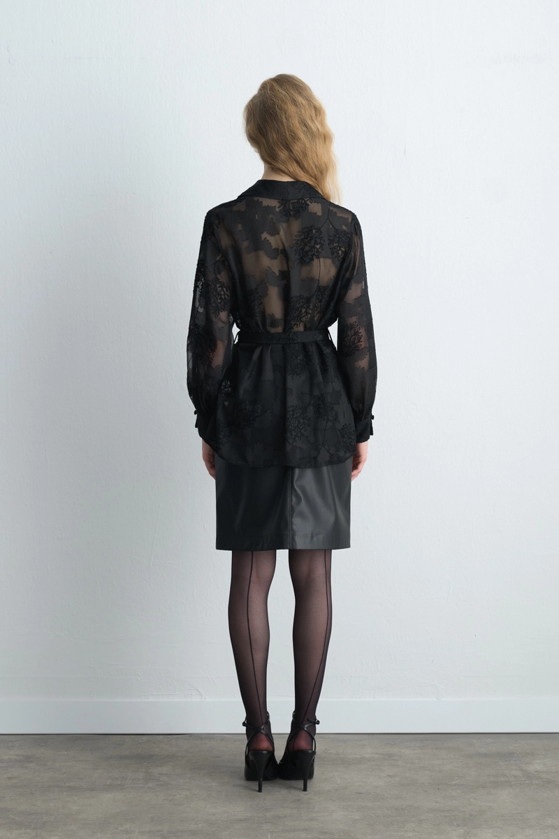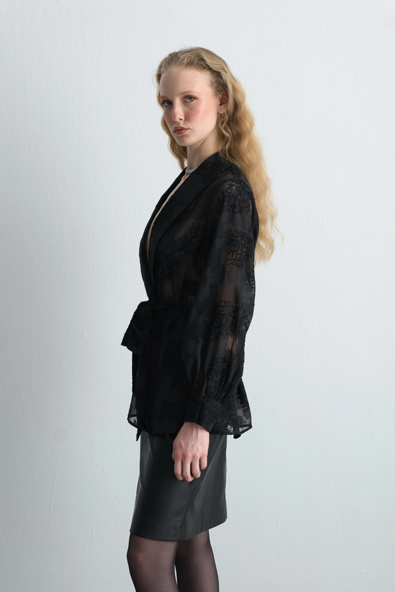 Hafif şifon dokusuyla zarif bir görünüm kazandırır. Nakış detayları feminen ve sofistike bir hava sunar. Siyah tonu kombinlere zamansız bir şıklık katar. Günlük stillerden özel davetlere kadar çok yönlü kullanılabilir.