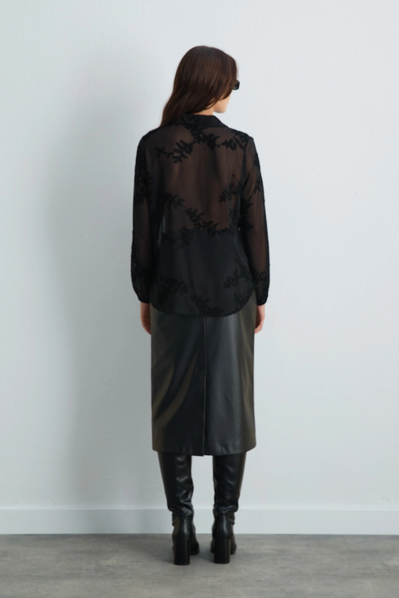 Zarif nakış detaylarıyla dikkat çeken siyah şifon gömlek, klasik şıklığı modern bir dokunuşla buluşturuyor. Hafif ve dökümlü şifon kumaşı sayesinde gün boyu konforlu bir kullanım sunarken, transparan dokusuyla da feminen bir duruş sergiler. İnce işlenmiş nakış motifleri, gömleğe romantik bir hava katar. Ofis şıklığından özel davetlere kadar birçok kombinle uyum sağlayan bu parça, sade altlarla tamamlandığında zarafetini ön plana çıkarır.