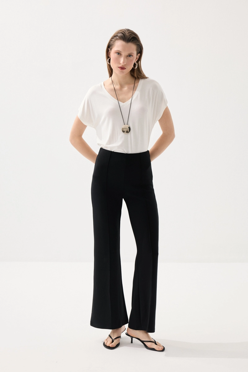 Nervür detayları ve İspanyol paça kesimiyle dikkat çeken bu örme pantolon, modern ve şık bir görünüm sunar. Esnek yapısı sayesinde gün boyu konfor sağlar. Vücuda uyum sağlayan formu ile zarif bir siluet oluşturur. Günlük ve şık kombinlerde rahatlıkla tercih edilebilir. Stilinize güçlü bir dokunuş katar.