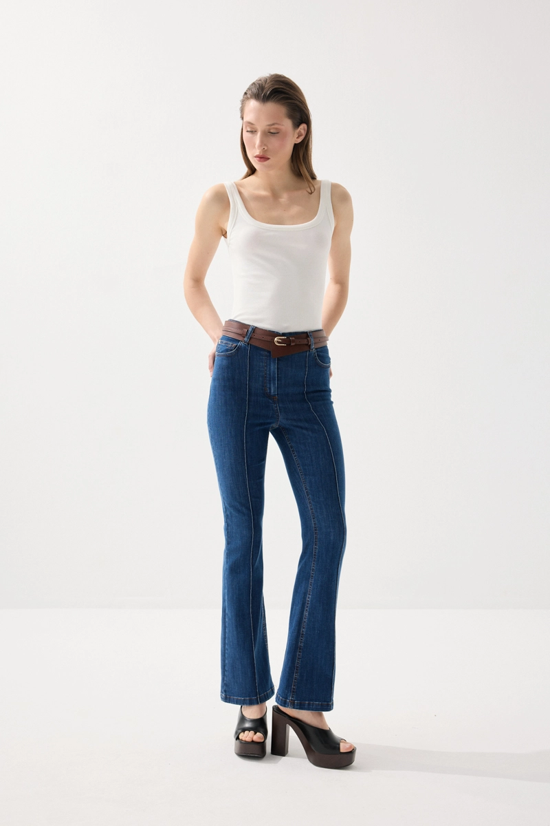 Nervür detaylarıyla modern ve zarif bir görünüm sunar. Dizden aşağı doğru genişleyen paça formu feminen bir siluet oluşturur. Denim kumaşı sayesinde konforlu ve dayanıklı bir kullanım sağlar. Günlük kombinlerde stil sahibi bir görünüm yaratır. Zamansız tasarımıyla gardırobun dikkat çeken parçalarından biridir.