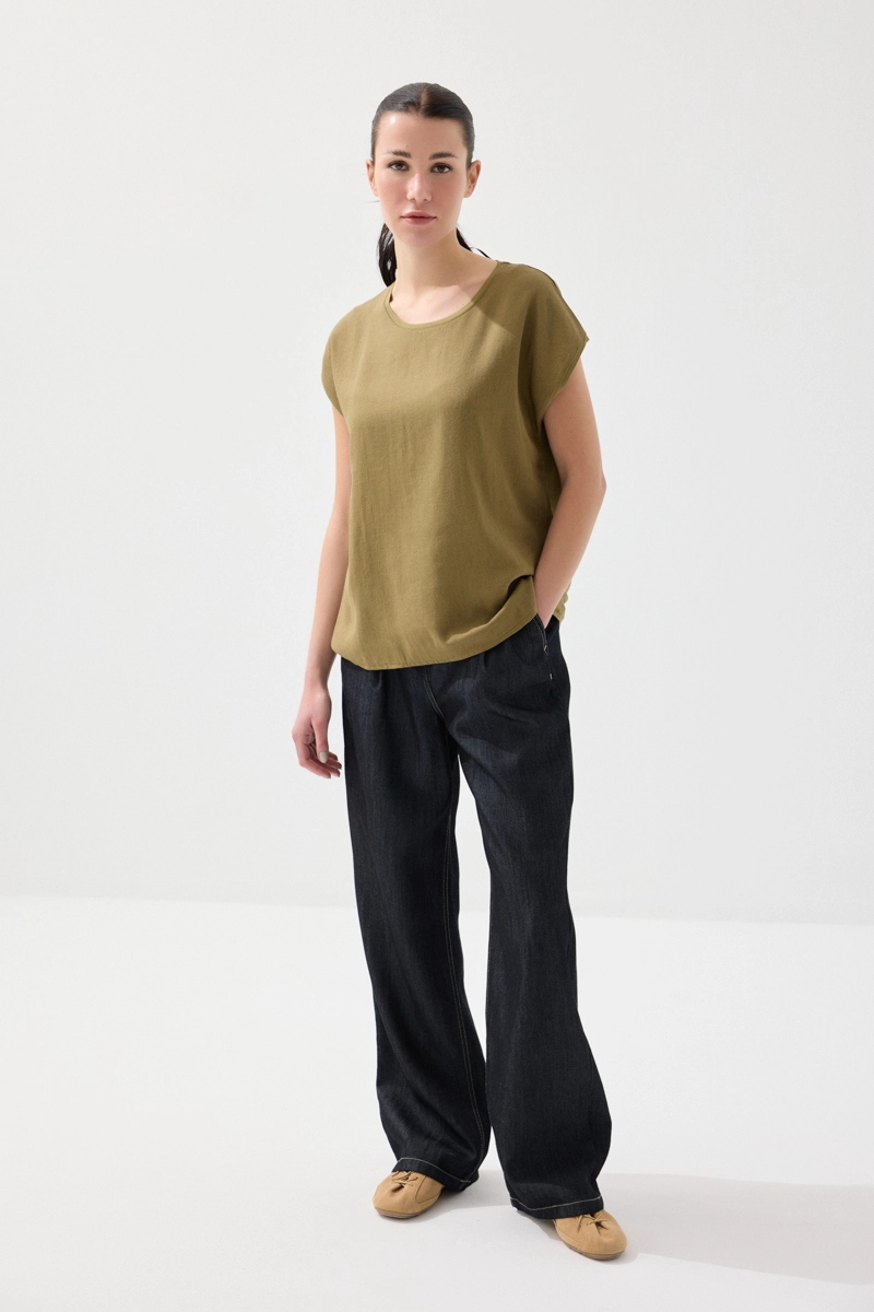 Doğal kumaş dokusuyla konforlu bir kullanım sunar. Haki tonlarıyla güçlü ve modern bir stil oluşturur. Hafif yapısı sayesinde gün boyu rahatlık sağlar. Günlük kombinlerle kolayca uyum yakalar. Sade ama etkileyici bir görünüm sunar.