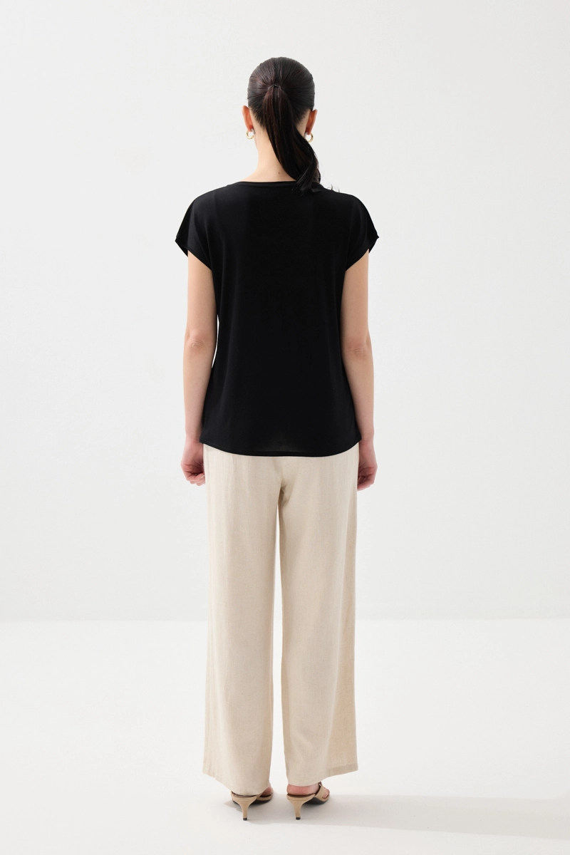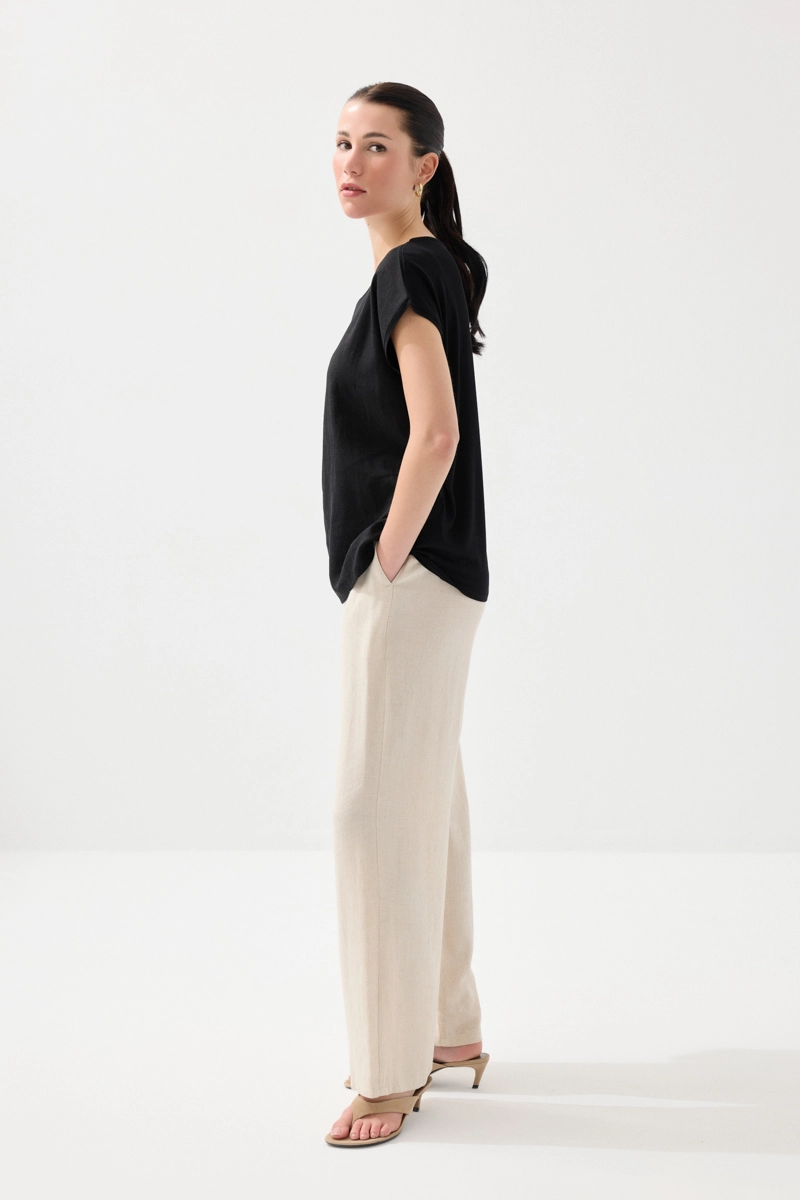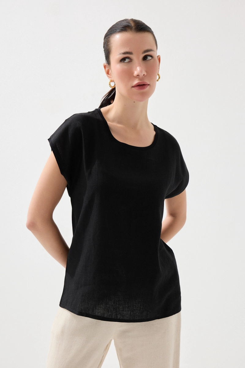 Klasik siyah tonuyla zamansız bir stil sunar. Keten dokusu sayesinde hafif ve konforlu bir kullanım sağlar. Minimal tasarımı, farklı kombinlerle kolayca uyum yakalar. Günlük şıklığı tamamlayan sade bir parçadır. Her sezon tercih edilebilecek temel tasarımlar arasında yer alır.