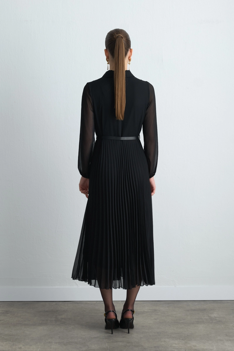 Pilise detayı zarif bir hareketlilik katar. Şifon dokusu hafif ve feminen bir hava sunar. Siyah tonu zamansız bir şıklık sağlar. Özel davetlerde stilinizi ön plana çıkarır.