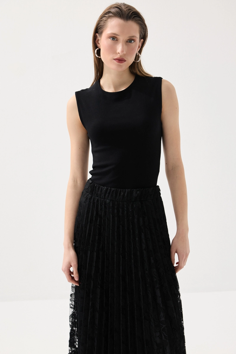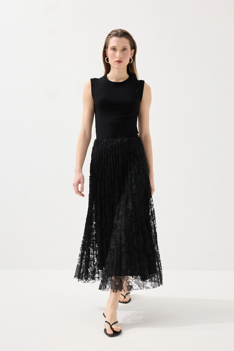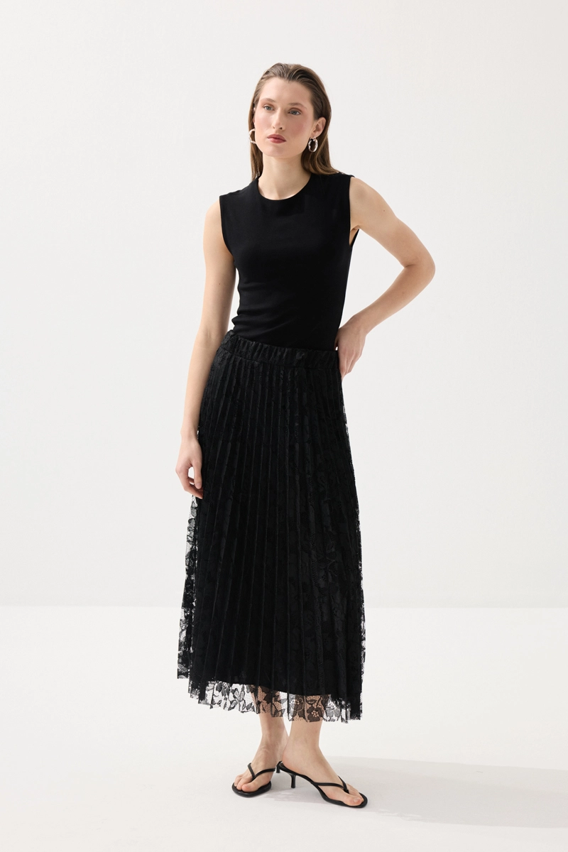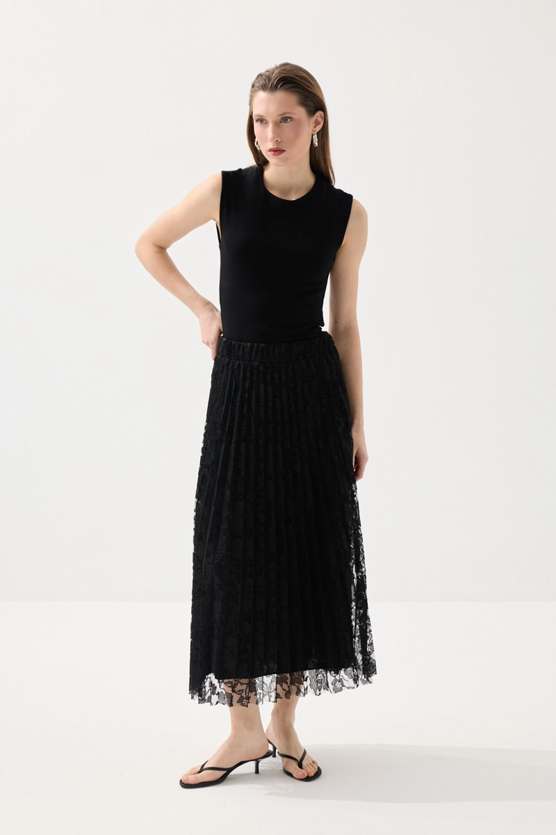 Piliseli formu ve dantel detaylarıyla zarif ve feminen bir görünüm sunar. Hareketli yapısı yürüdükçe şık bir siluet oluşturur. Günlük stilin yanı sıra özel kombinlerde de tercih edilebilecek bir parçadır. Modern ve zarif tasarımı farklı üstlerle kolayca uyum sağlar. Zamansız duruşuyla stilinizi tamamlar.