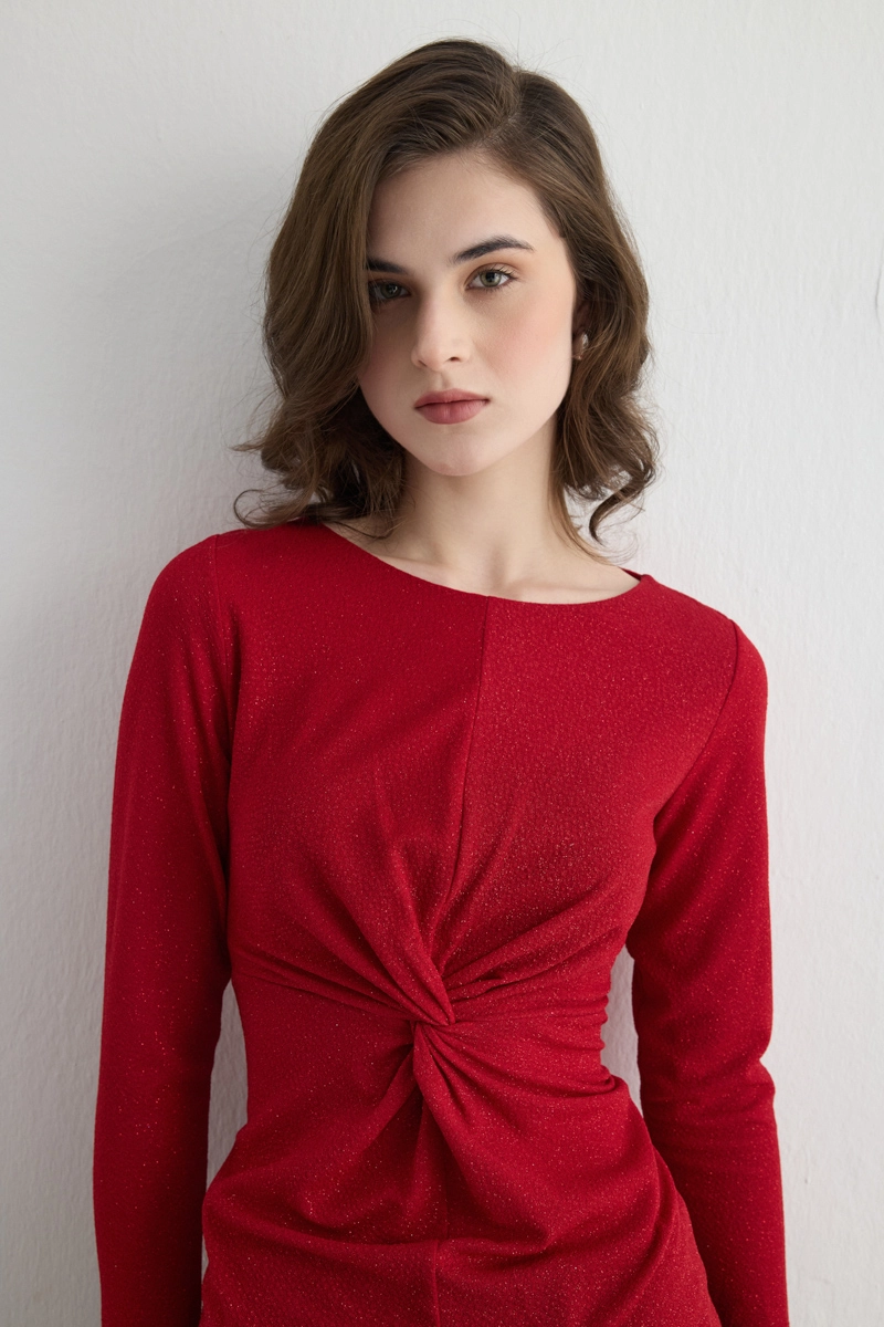 Canlı kırmızı ton ve ışıltılı dokusu, özel davetlerde dikkat çekiyor. Bele oturan kesim feminen bir siluet oluşturuyor. Parlak detaylar zarafeti artırıyor. Şık etek veya pantolonlarla kombinlendiğinde göz alıcı oluyor. Akşam yemekleri ve davetler için ideal bir tercih. Enerjik ve iddialı duruş sergiliyor.
