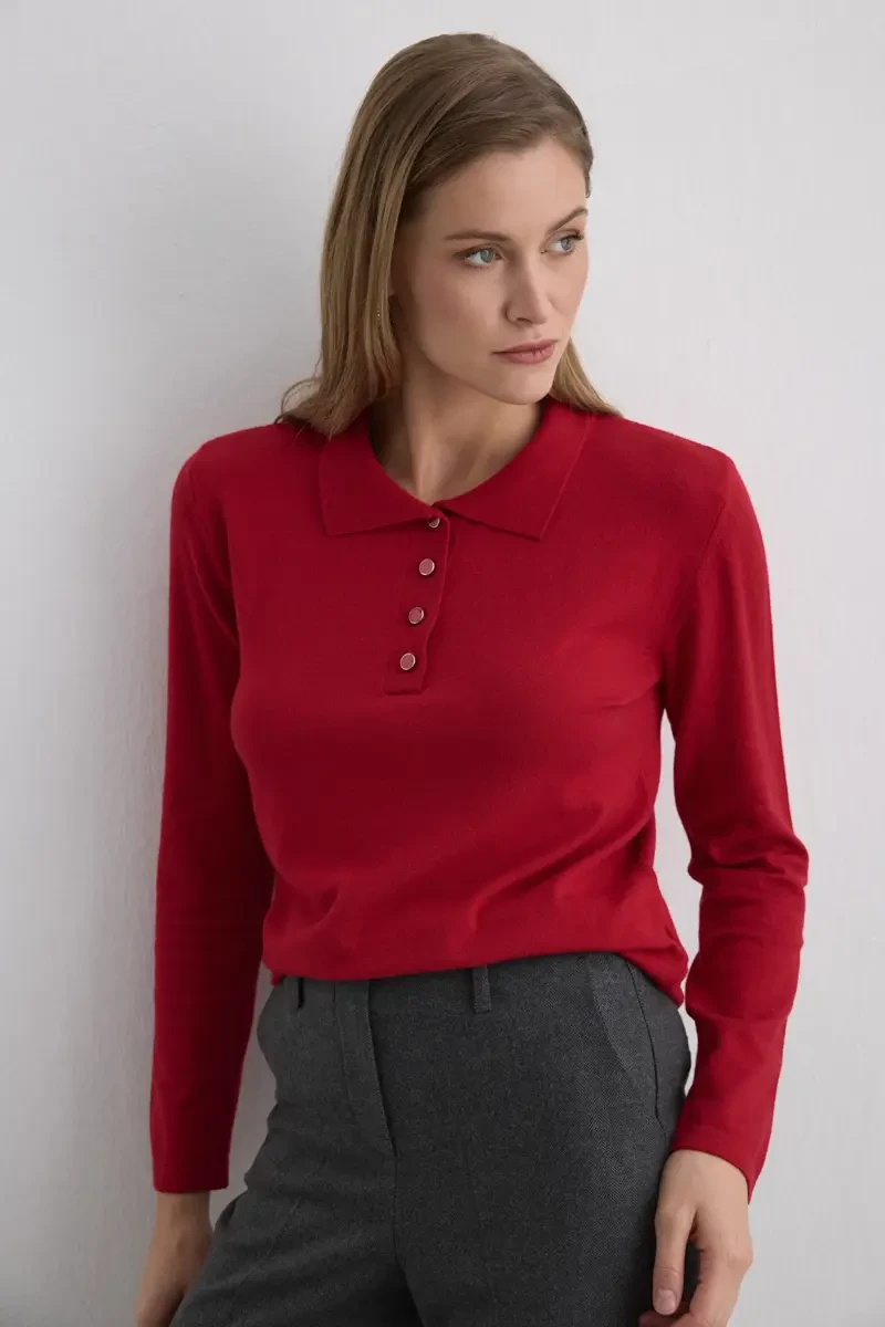 The classic polo collar is given a modern touch with a knit texture. Button details add sporty elegance, and its vibrant color creates an energetic appearance. Comfortable and striking for everyday outfits.