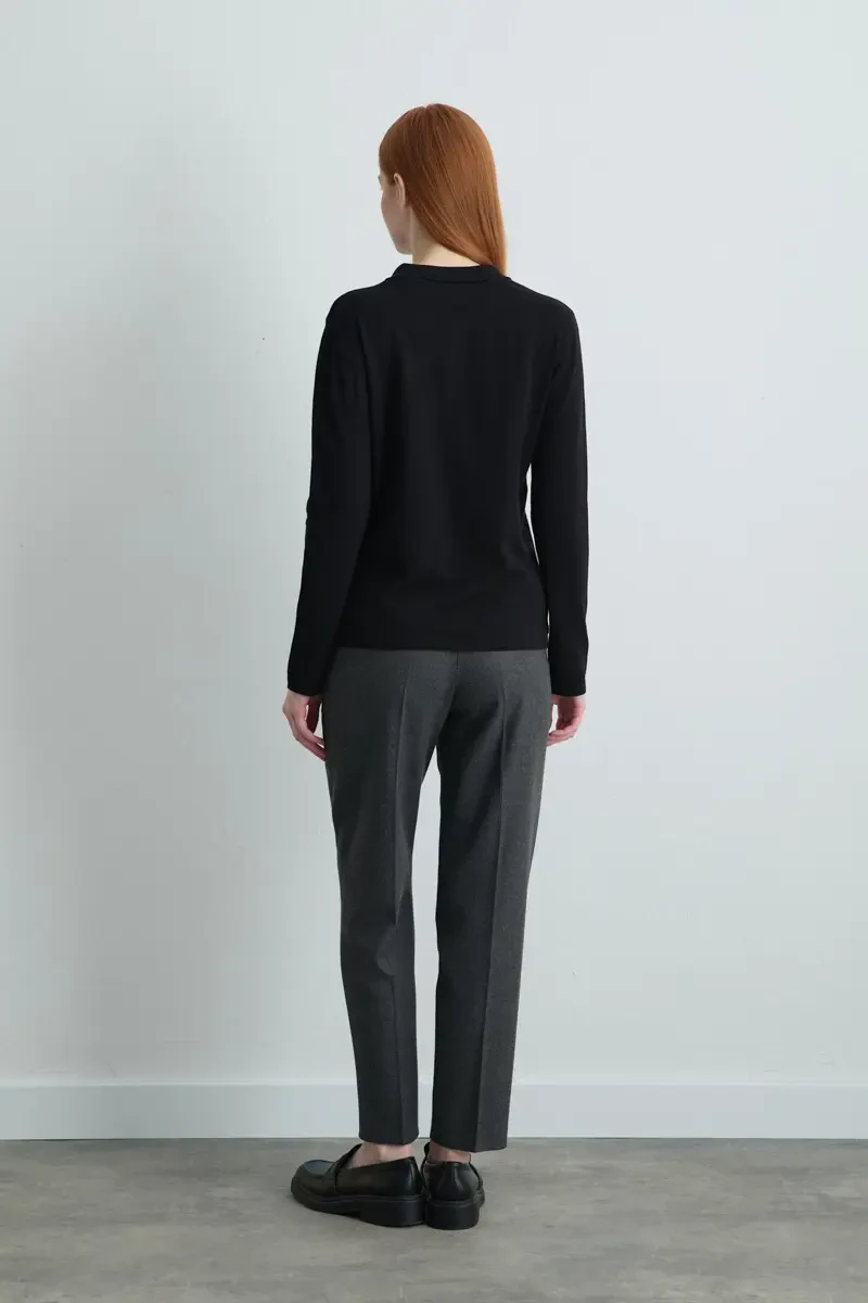 Classic and simple black polo-neck knit blouse stands out with button detailing on the front for an elegant touch. Its soft texture ensures all-day comfort and pairs easily with stylish skirts or trousers.