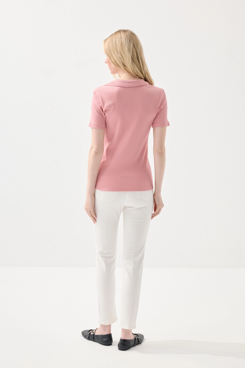 Şık polo yaka detayıyla klasik ve modern tarzı bir araya getiren bu t-shirt, kaşkorse dokusu sayesinde vücuda uyum sağlar. Yumuşak ve esnek yapısı gün boyu konfor sunarken, nefes alabilen kumaşı ile ferah bir kullanım sağlar. Günlük kombinlerden ofis stiline kadar geniş bir kullanım alanı sunar. Zamansız tasarımı ile gardırobun kurtarıcı parçalarından biri olmaya adaydır. Farklı alt giyim ürünleriyle kolayca kombinlenebilir.