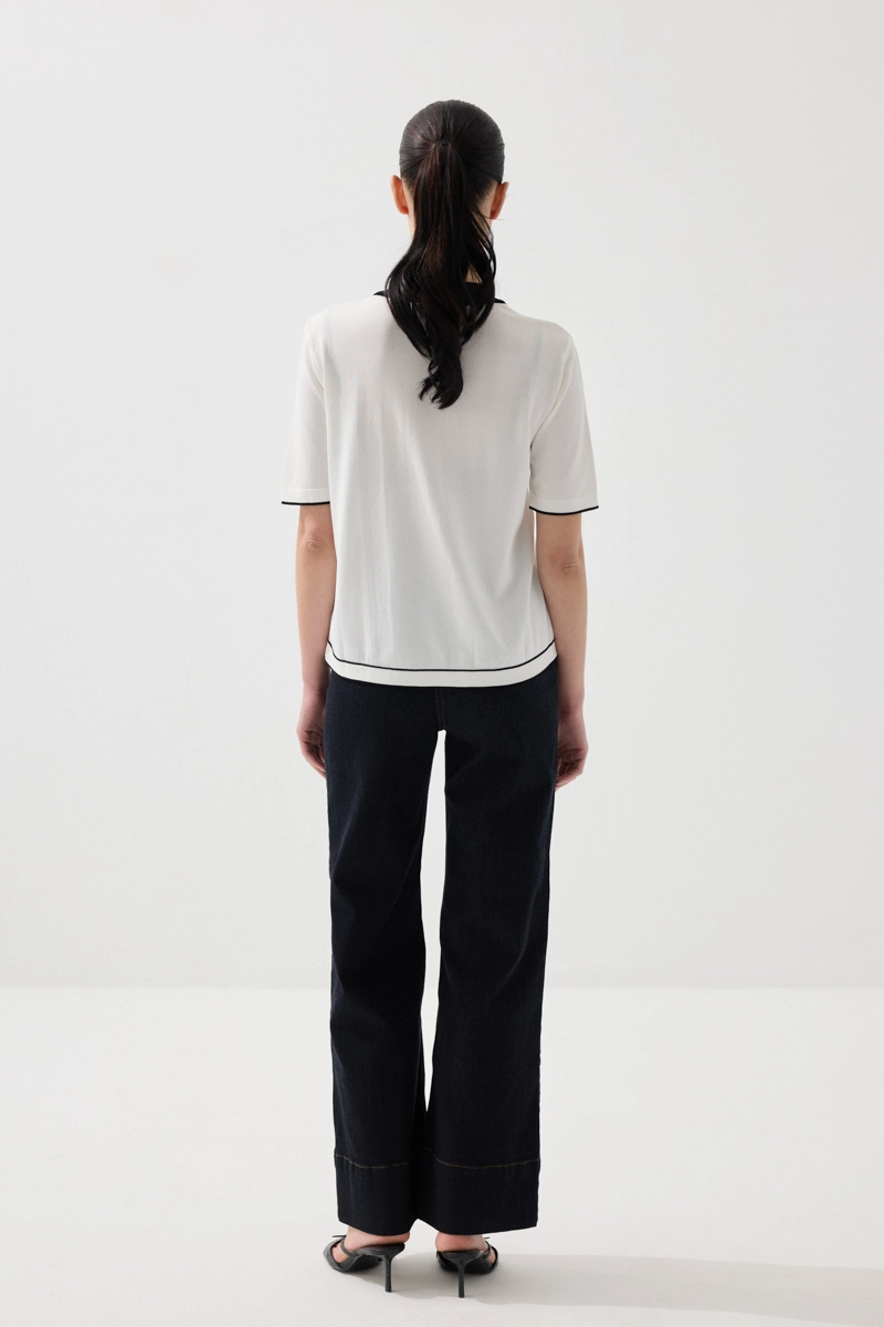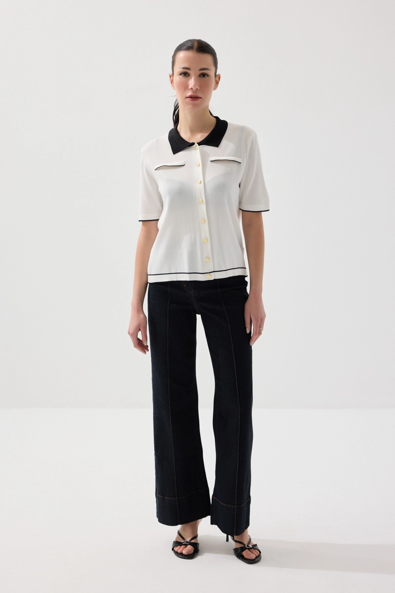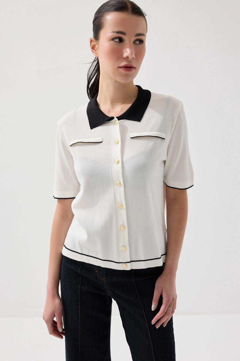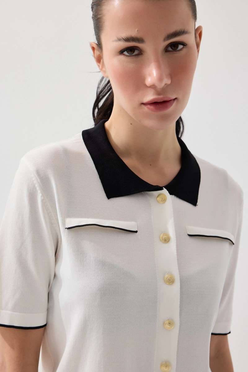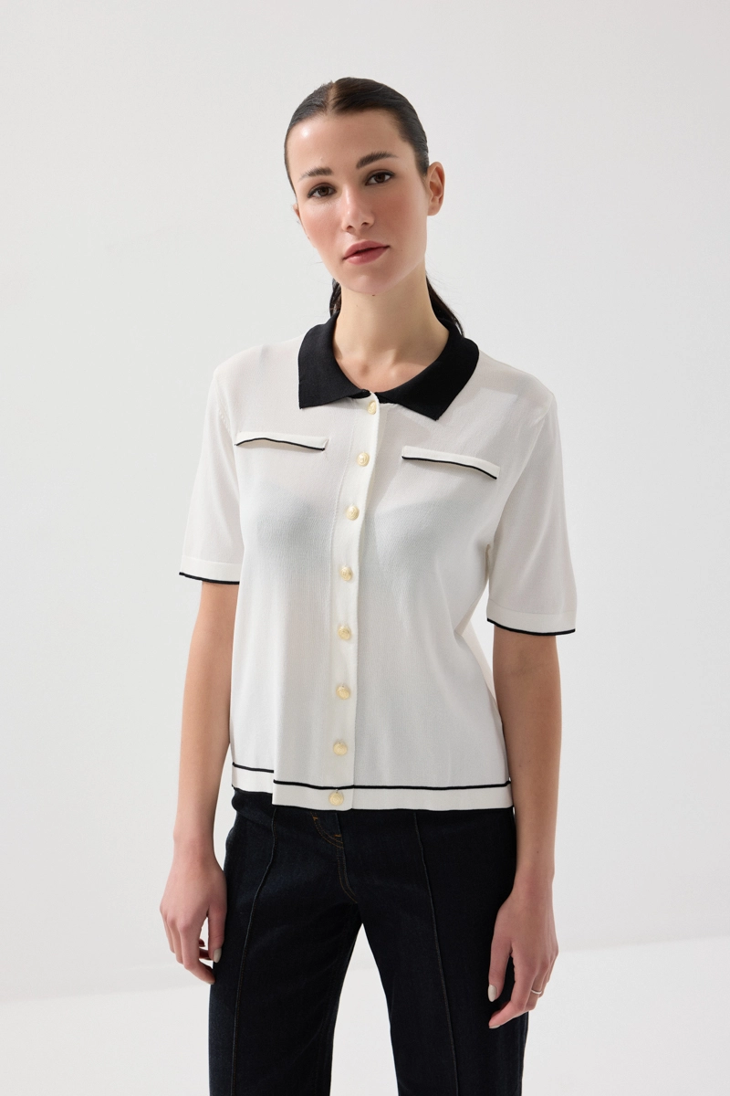 Zarif yaka detayıyla klasik ve modern stilin uyumunu yansıtır. Merserize triko dokusu sayesinde yumuşak ve konforlu bir kullanım sunar. Beyaz tonu ile ferah ve şık bir görünüm oluşturur. Günlük ve ofis kombinlerine kolayca uyum sağlar. Sade ama etkileyici bir parçadır.