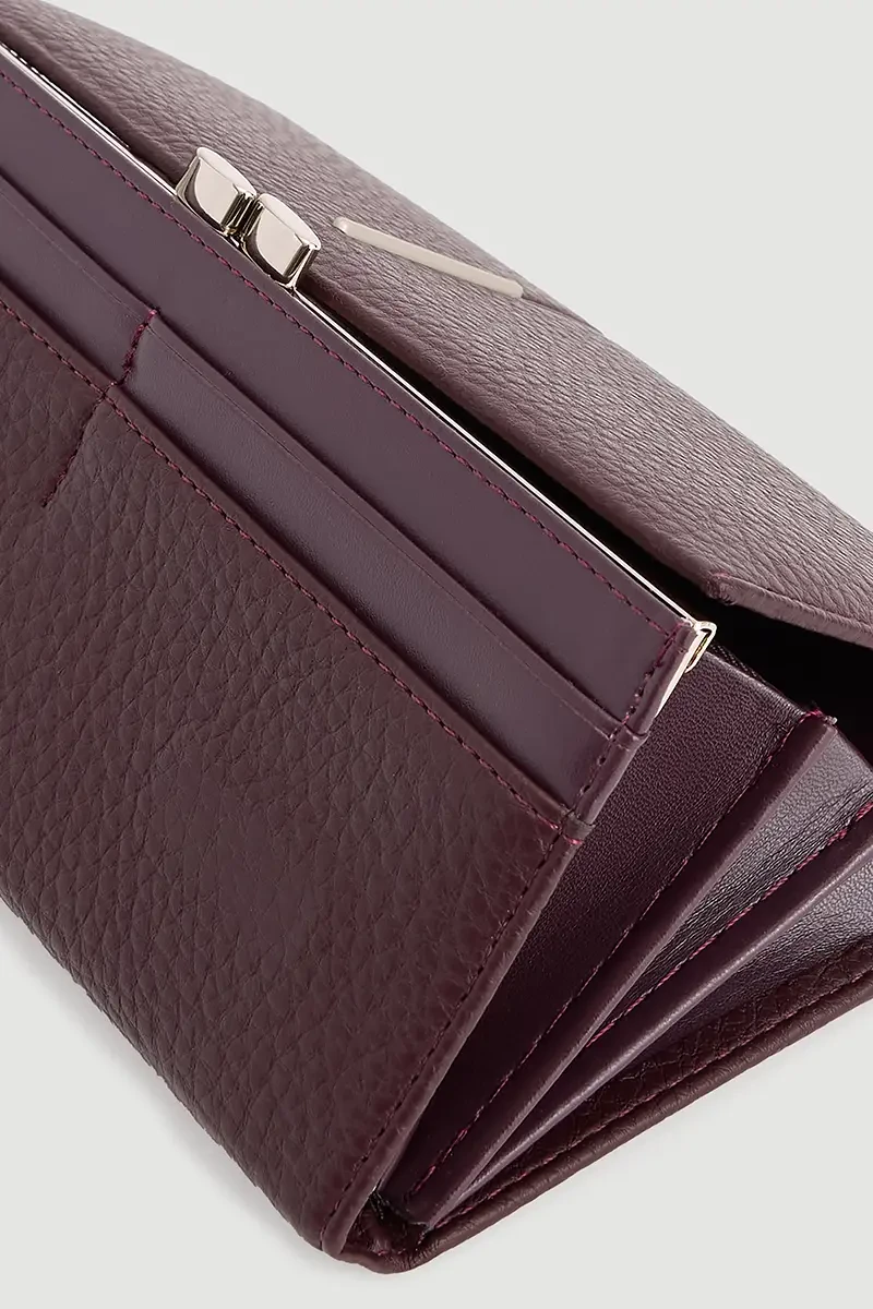 This clutch wallet, in a rich plum tone, gains a sophisticated touch with metal accents. Its interior compartments allow organized use, and the compact design fits easily into any bag. Elegant and modern, suitable for both daily and special occasion styling.
