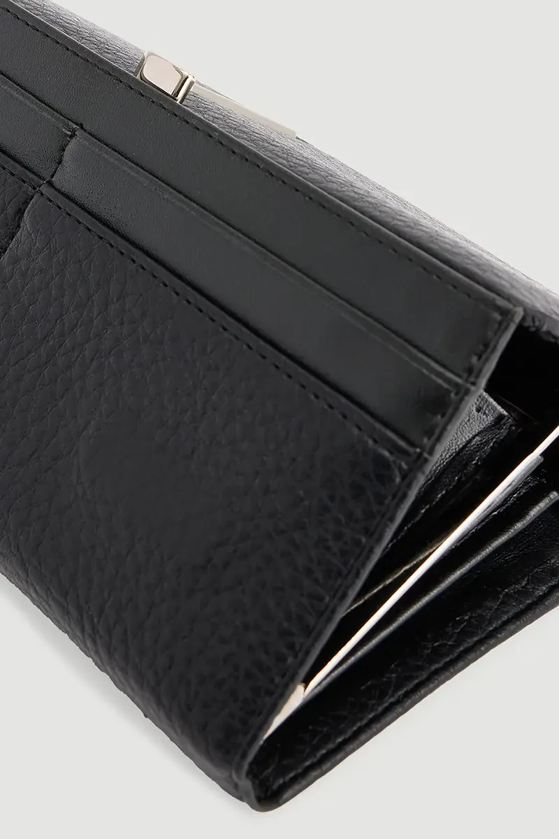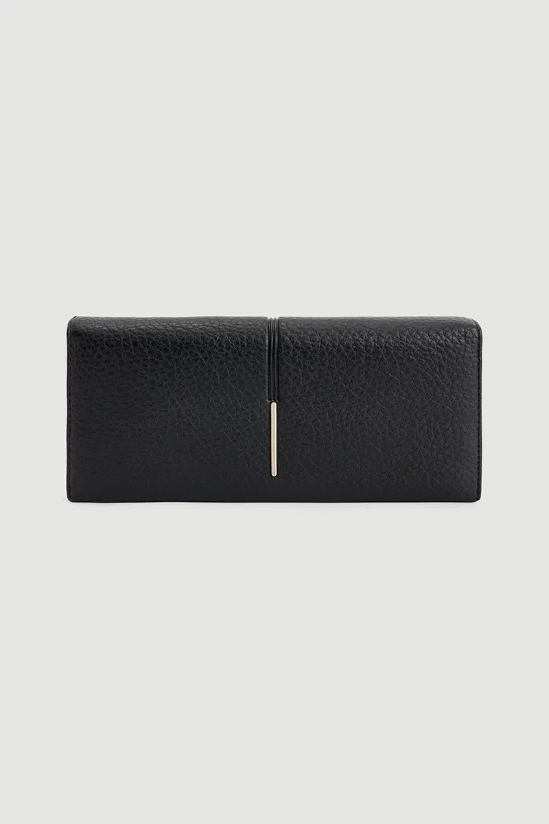 This black clutch wallet combines style and functionality with its metal-accented design for a modern appearance. Its spacious interior allows organized storage of cards and cash, while the compact size ensures practical use in a bag. A chic accessory that complements both daily and special occasion outfits.