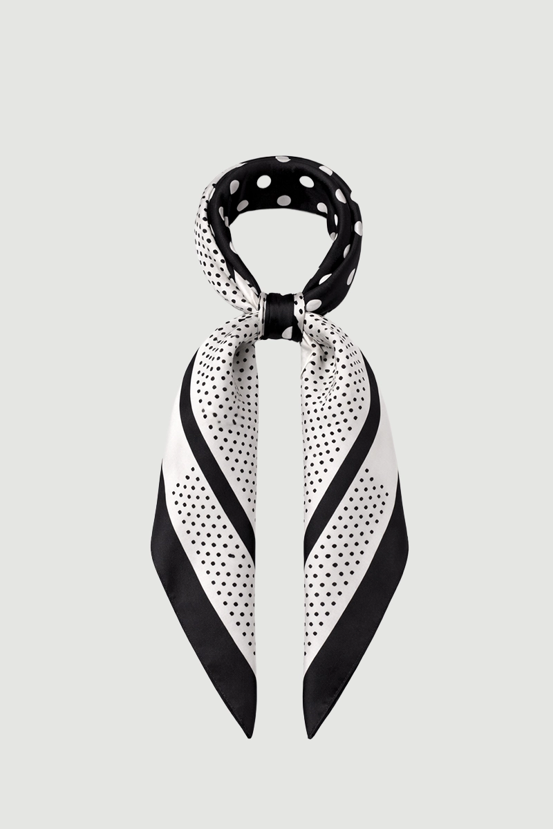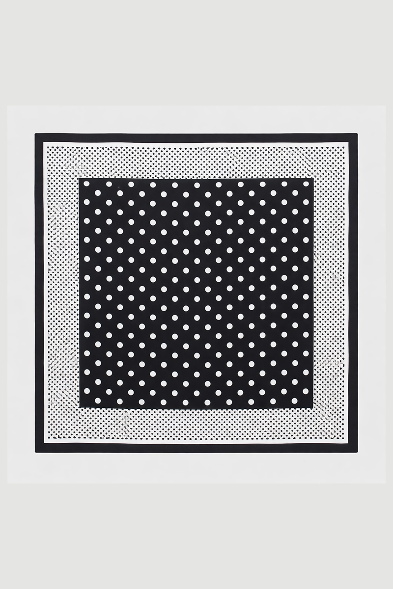 Klasik puantiye deseniyle zamansız bir stil sunar. Siyah tonun asaletiyle her kombine kolayca uyum sağlar. Yumuşak ve hafif yapısı konforlu kullanım sağlar. Büyük formu farklı bağlama stilleri için idealdir. Günlük şıklığı tamamlayan zarif bir aksesuardır.
